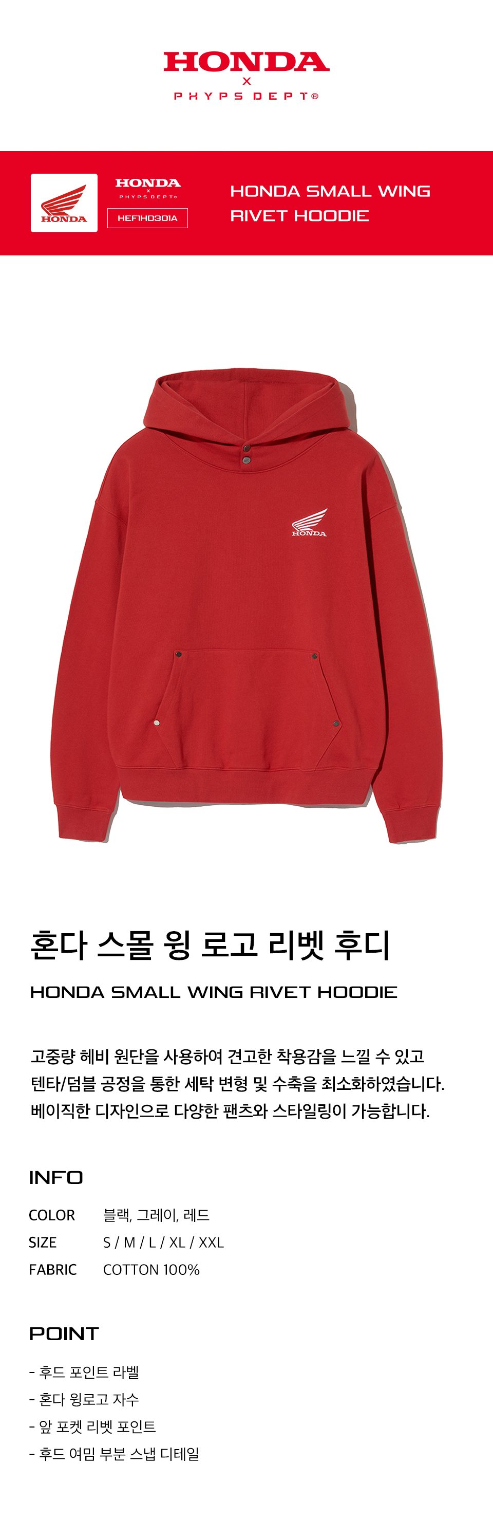 혼다 스몰 윙 리벳 포인트 후디 레드