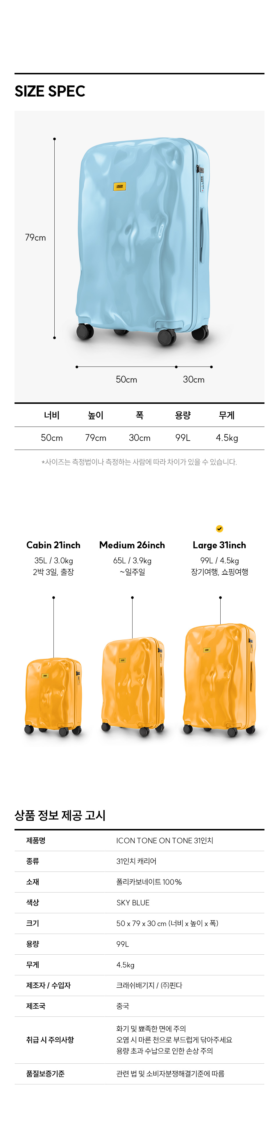 크래쉬배기지 아이콘 톤온톤 라지 31인치 캐리어 스카이 블루