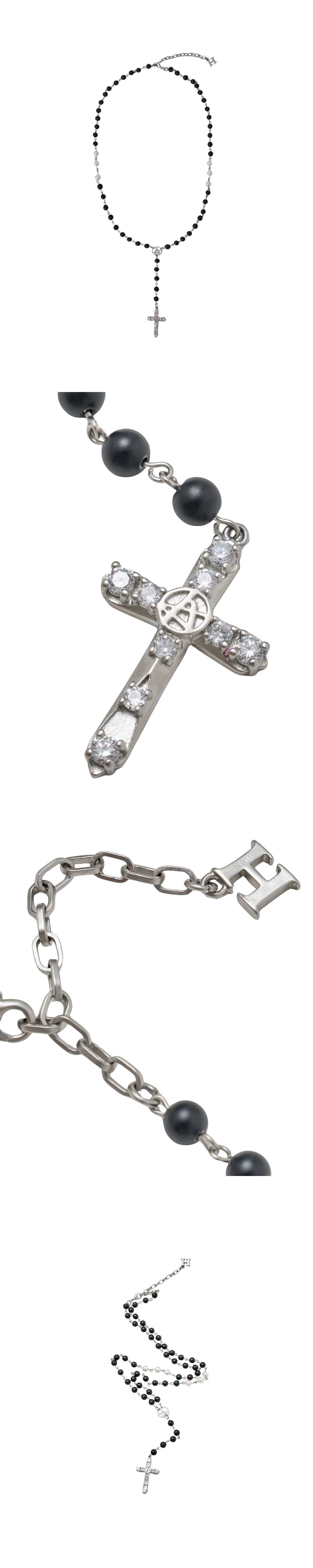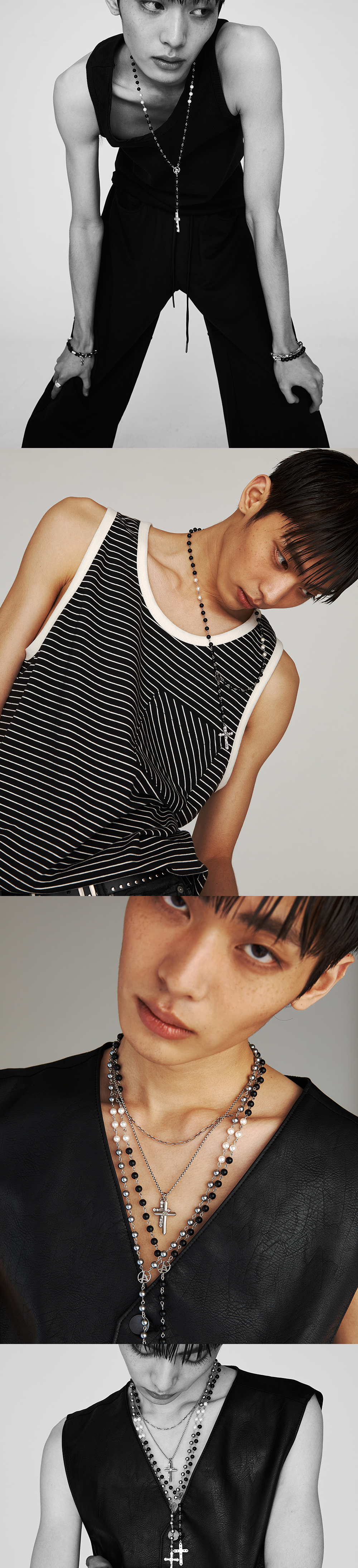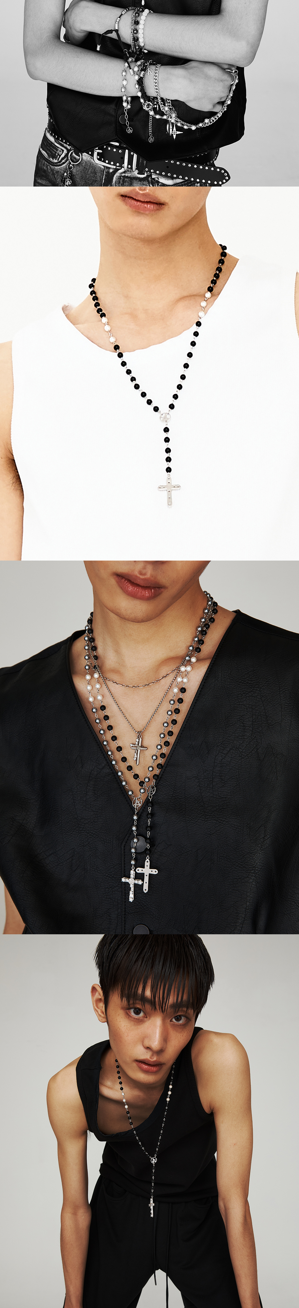크리스탈 십자가 펜던트를 중심으로 이어지는 비즈 체인 네크리스입니다. 블랙 비즈와 소량의 화이트 진주 디테일이 리듬감 있게 배치되어, 전통적인 로자리오 형식을 재해석한 유니크한 실루엣을 완성합니다. 단독 착용해도 존재감이 강하며, 다른 체인 아이템과 레이어드할 경우 입체감이 더욱 살아납니다. *천연 원석 특성상 개체 차이가 있을 수 있는 점 참고 부탁드립니다.* *수작업으로 철사를 연결시키는 과정에서 미세한 기스가 있을 수 있습니다.* - _x0008_DEATIL - 크리스탈 십자가 로고 펜던트 로자리오 형식의 드롭 구조