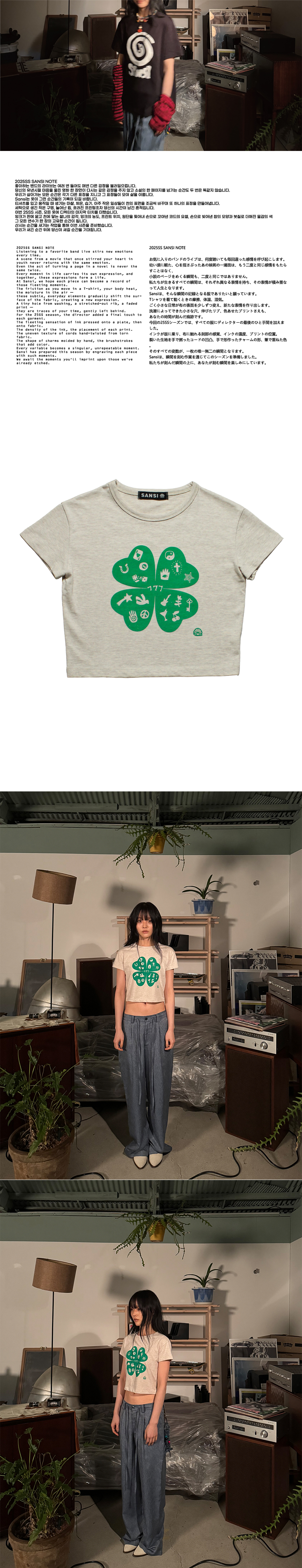 Sansi의 그래픽 티셔츠는 디렉터가 직접 제작한 실크스크린 판으로 하나하나 손으로 프린팅됩니다. 프린팅 과정에서 생기는 미세한 차이 — 잉크의 양, 위치, 틀어짐 등은 모두 의도된 결과이며, 이는 기계로 찍어낸 옷에서는 느낄 수 없는 오직 당신만의 유일한 한 장을 의미합니다. Material -Cotton 100% - 머서라이징 가공으로 은은한 광택과 가볍고 부드러운 촉감을 가진 원단