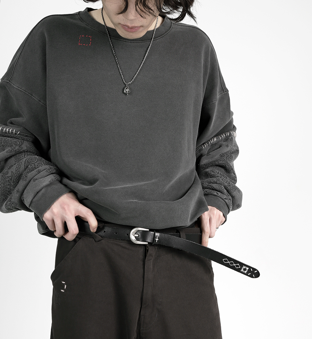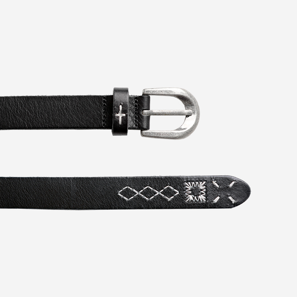[올드레거시_블랙] 워싱처리 된 천연 소가죽을 가죽 본연 그대로 재단하여 핸드스티치로 마무리했습니다. 주름진 가죽의 질감 위로 다양한 모양들이 수놓아져 오래된 유물 같은 느낌을 자아냅니다. *디테일 벨트 고리/끝단 핸드스티치 빈티지 버클