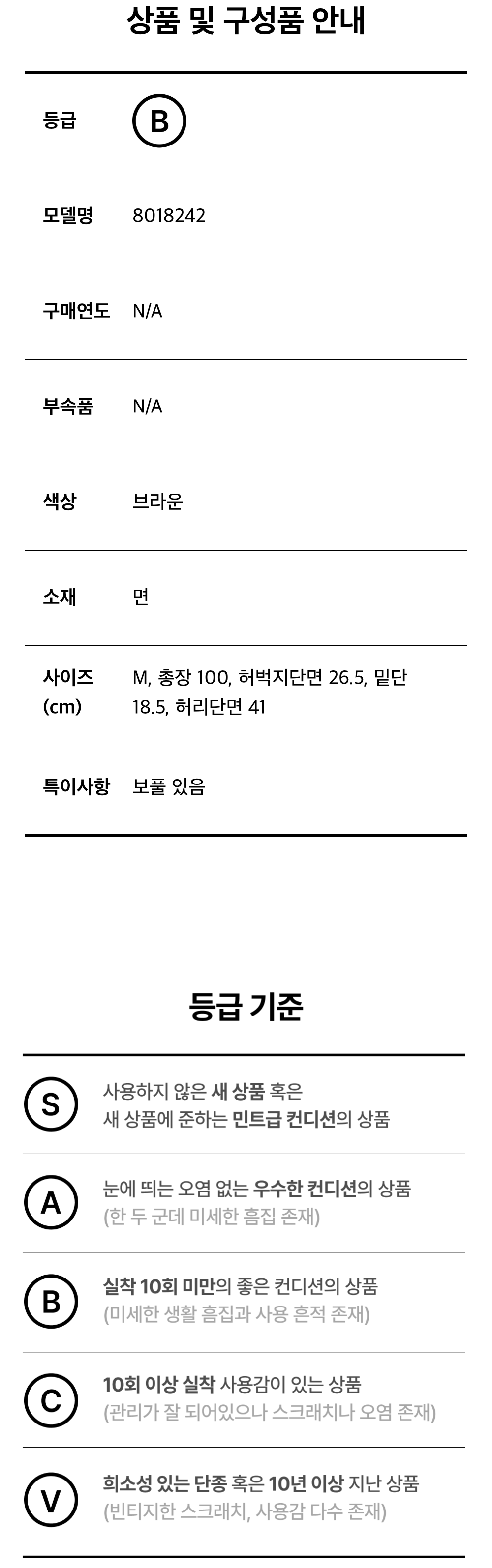 모든 상품(가죽, 의류, 잡화, 슈즈 등)은 사용자의 사용방법과 환경에 따라 변형, 변색이 될 수 있으니 반드시 취급 라벨에 표시된 관리 안내를 따르시길 권장 드립니다. 이는 정도의 차이가 있으며 과도한 체열과 땀, 습기, 빛, 마찰은 제품의 손상 및 변형을 일으킬 수 있으므로 주의하시길 바랍니다.