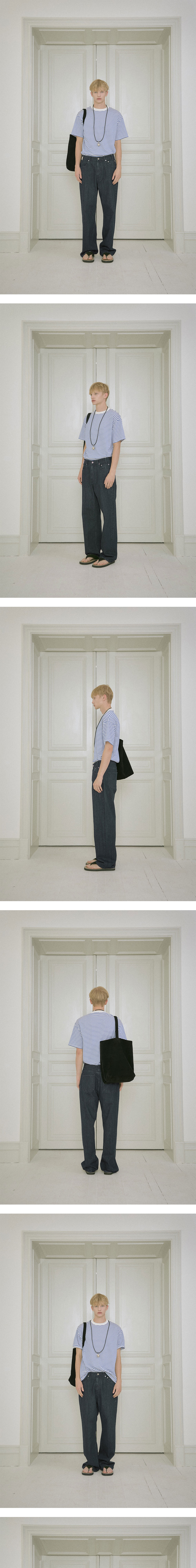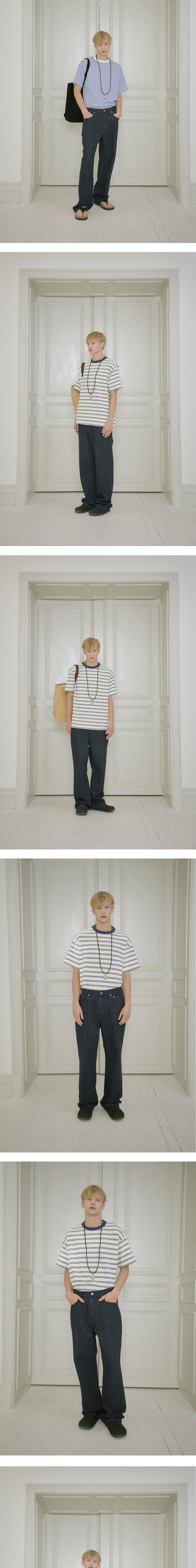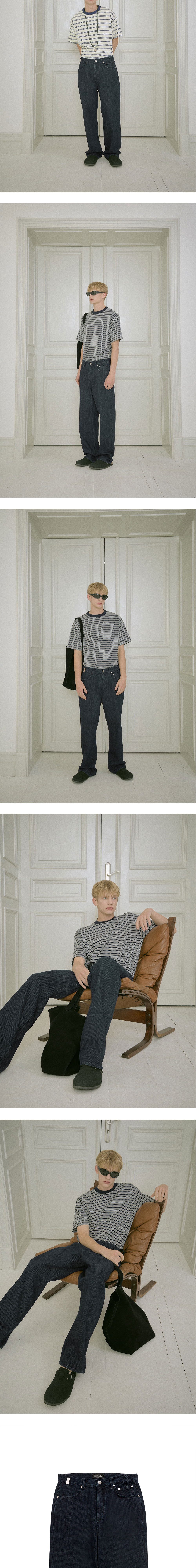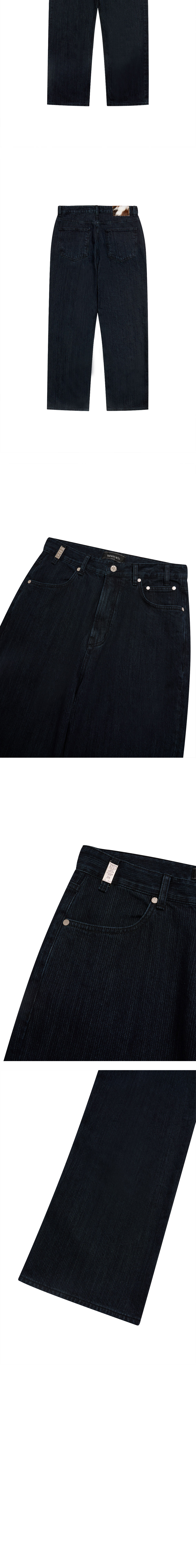-13 온즈 - 스트레이트 핏 - 스트라이프 텍스쳐 - 5포켓 디테일 - 메탈 벨트 고리 디테일 - 송치 라벨 디테일 - 로고 각인 켄톤, 리벳 - YKK 지퍼 - 내부 울 실 처리