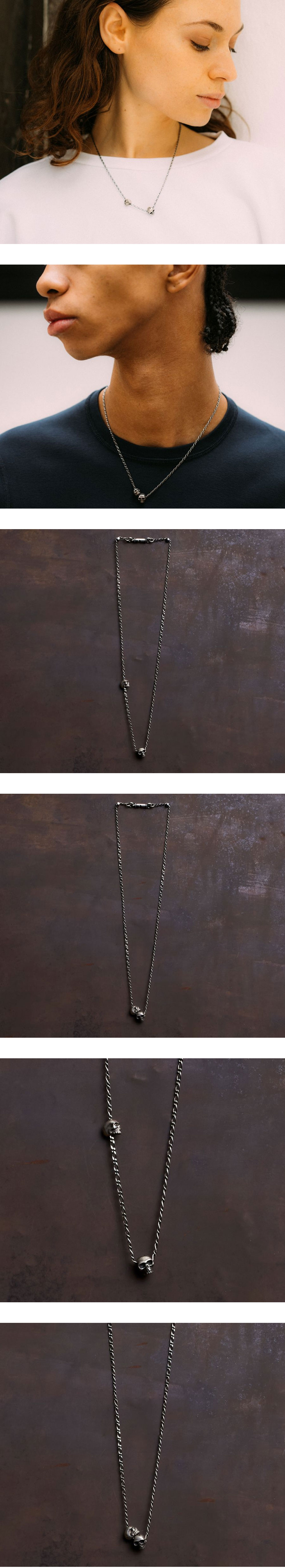두 개의 실버 해골이 가느다란 실버 체인에 연결된 베르크슈타트 뮌헨의 짧은 네크리스 -삶의 유한함과 아름다움을 표현한 'Vanitas' 테마 -자체 제작된 바요넷 클로저