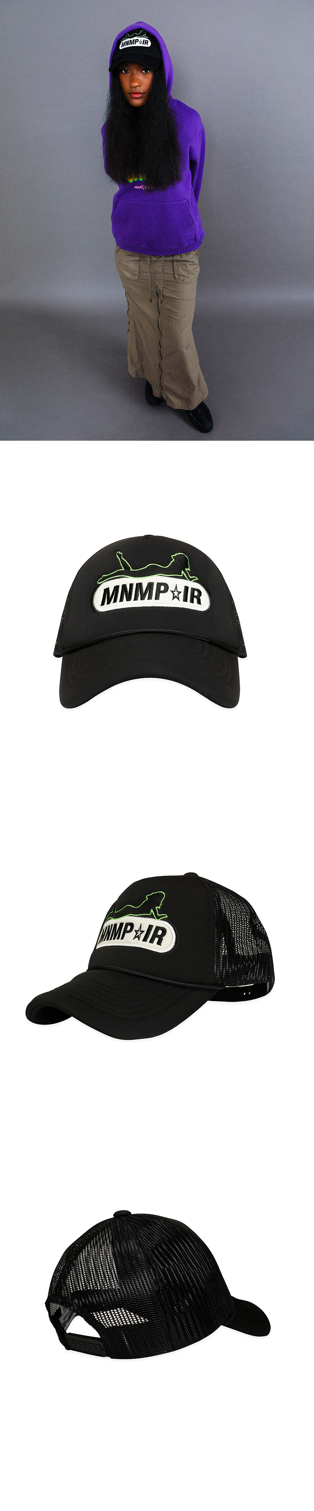 ☆ information -Embroidered girl graphics -I don't have a truck, but I love trucker cap! ☆ Matrerial & Care Polyester 100% Gentle hand wash / Dry cleaning ☆ Size OS Brim Length : 7cm Depth : 17cm Circumference : 59cm~64cm