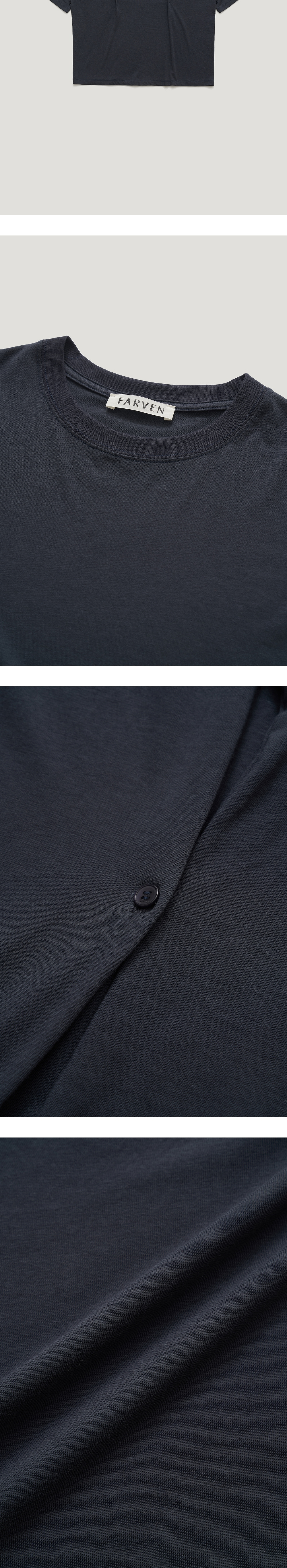 베이직한 디자인에 버튼디테일이 들어가있는 4-way 반팔티셔츠입니다. 전체적으로 루즈한 실루엣에 얇은 소재감이 내추럴한 무드를 강조해주며 코튼,모달 혼방소재로 탄탄하고 견고하며 소프트한 터치감이 특징인 제품 입니다. 양쪽 허리라인에 파르벵 로고가 각인된 버튼이 달려있으며 전/후면에 두개의 버튼구멍이 있어 무드에 맞게 다양한 스타일링이 가능하여 활용도 높은 아이템입니다. 버튼을 다 풀어입거나 양쪽을 모두 클로징하는형태, 전면부에서 사선으로 클로징, 후면부에서 사선으로 클로징하는 방식으로 MEMO STRING MODAL SKIRT와 셋업으로 착용이 가능합니다. TAMO wearing a size FREE. MODEL : HEIGHT 172 / BUST 39 / WAIST 30 / HIPS 44