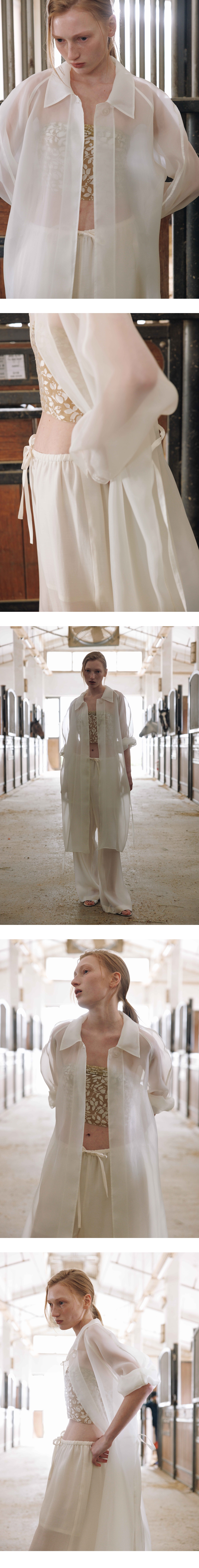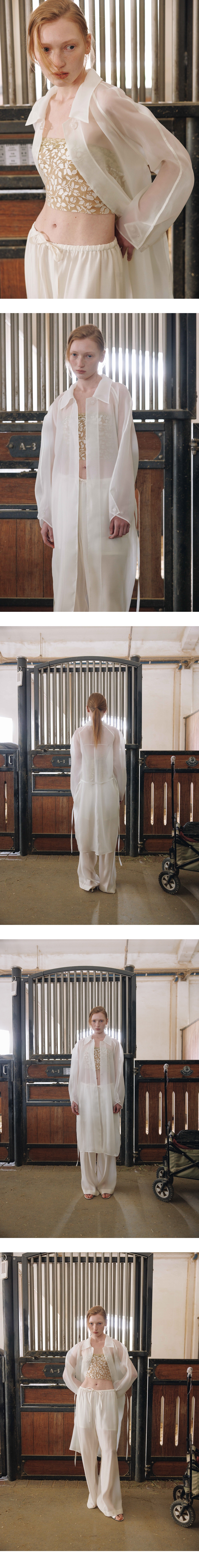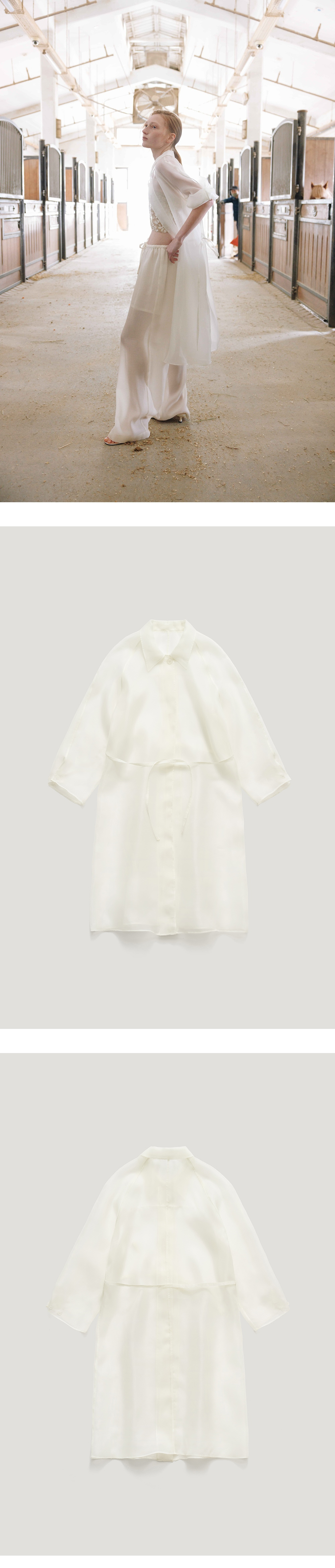 부드러우면서 가벼운 착용감을 느낄 수 있는 싱글 버튼 롱 코트입니다. 자 연광이나 조명 아래에서 은은하게 빛나는 시어한 소재를 사용해 고급스러 움이 느껴지며 자연스러운 비침이 있어 다양한 이너와 레이어드하기 좋습 니다. 둥글게 떨어지는 래글런 소매와 다운된 넥 카라가 어우러져 클래씨한 무드가 느껴지는 디자인이며 양 사이드 포켓을 덜어내 클린한 실루엣이 돋 보이도록 했습니다.로고 각인된 투명 단추로 넥과 소매 라인 여밈과 사이즈 조절이 가능하며 탈부착 가능한 얇고 섬세한 스트랩으로 다양한 스타일링 연출이 가능합니다. 써머 시즌 시그니처 디테일인 다트 디테일을 활용해 디 자인에 포인트를 주었습니다. TAMO wearing a size FREE. MODEL : HEIGHT 172 / BUST 39 / WAIST 30 / HIPS 44