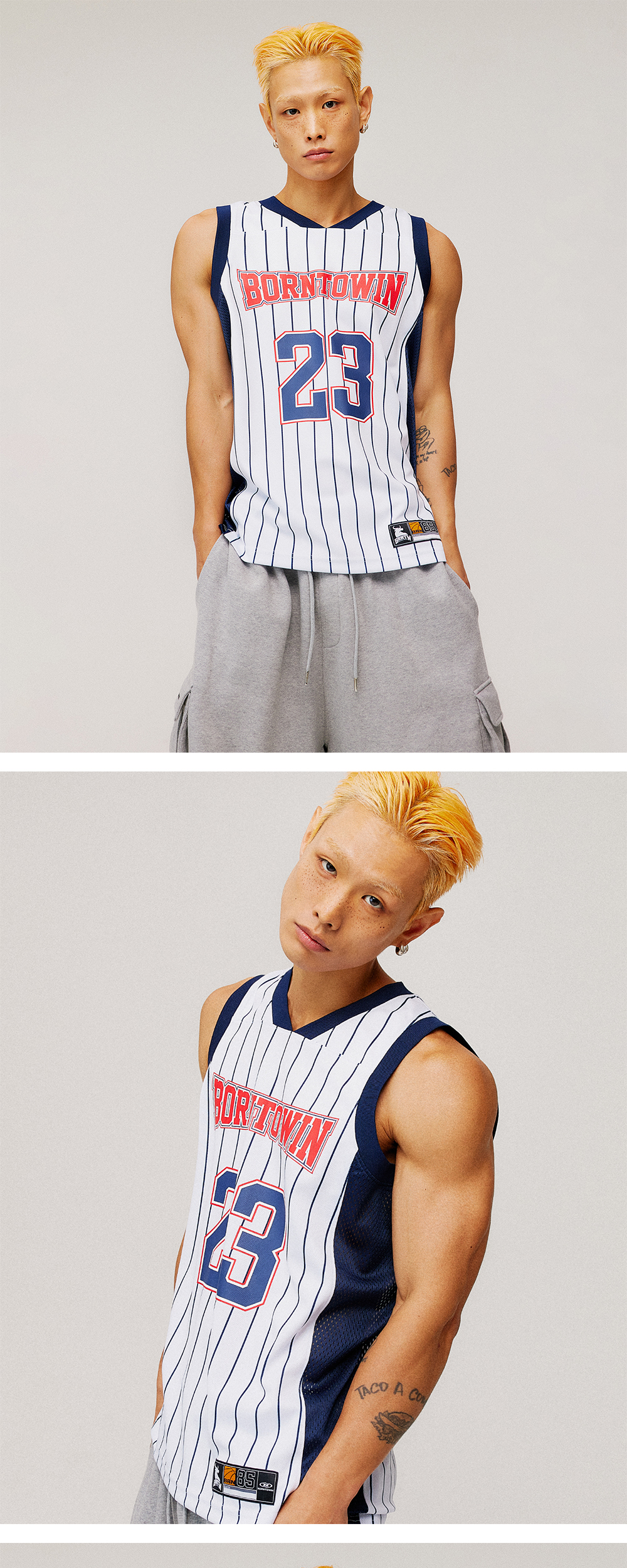 [DETAILS] * 넘버 23 바스켓볼 슬리브리스 - 흡습속건 메쉬 원단 - 메쉬 배색 디테일 - 그래픽 로고 포인트 - 시즈널 라벨 포인트 - 오버 사이즈 Material : Polyester 100% Fitting : DS 1 Size, 178cm, 70kg