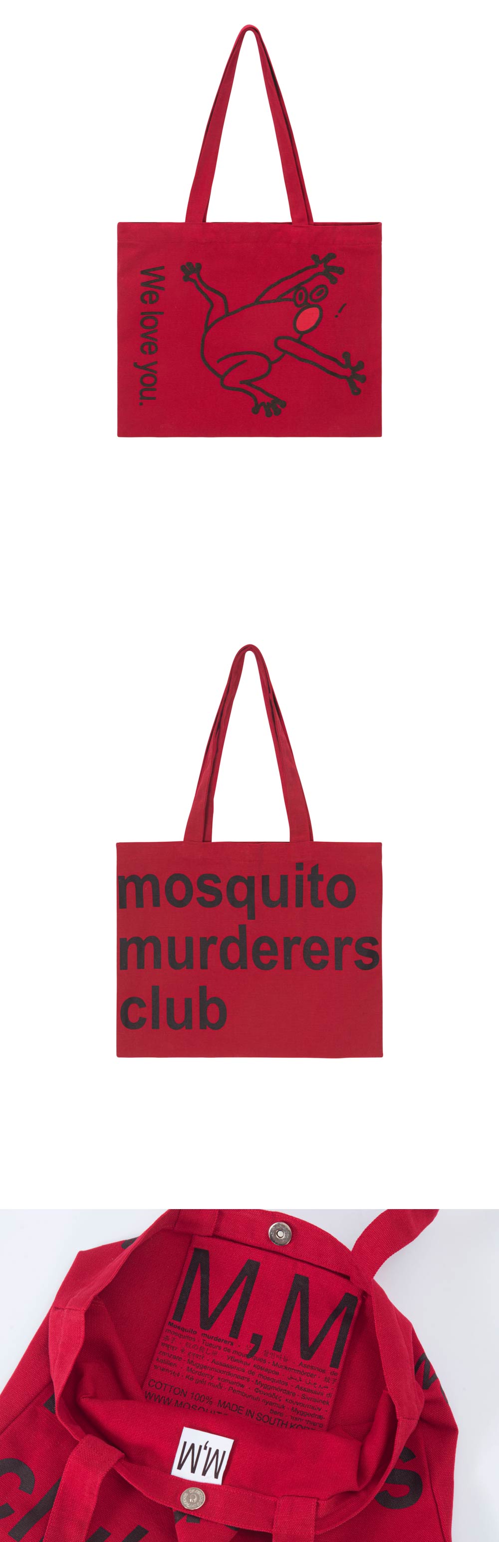 - 100% Cotton<br>- 도톰하고 탄탄한 원단으로 내구성이 우수한 토트백<br>- 내부 포켓과 마그넷 오픈 클로징<br>- 벗겨지거나 바래지 않는 선명한 프린팅<br><br> Mosquito murderers의 모든 의류는 한땀 한땀 사람의 손으로 탄생됩니다.<br>세탁시 케어라벨을 확인해 주시고, 프린팅의 손상을 최소화 하기 위해 뒤집어 세탁하는 것을 권장합니다.