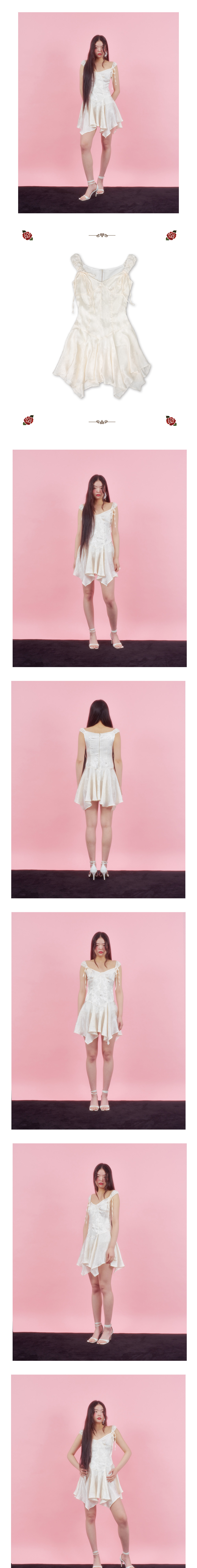 스판있는 원단, 어깨 리본 디테일, 밑단 페어리 스커트, 새틴 자카드 장미 패턴 원단