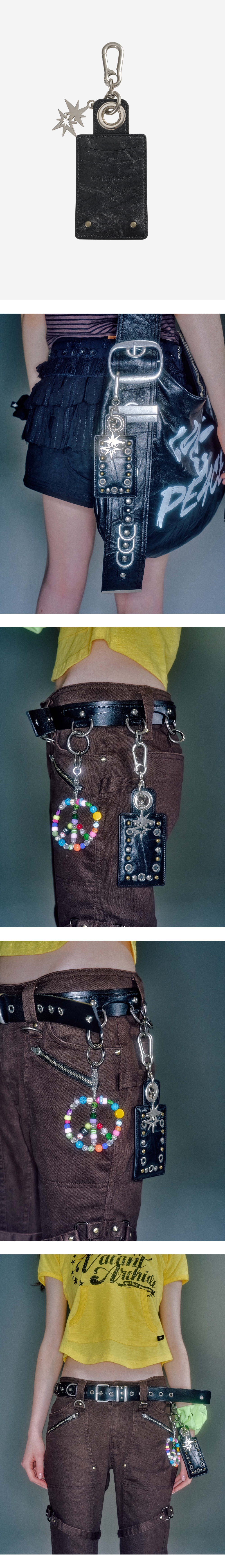 - 주름 가공이 들어간 양가죽 소재 사용 - 리벳 & 아일렛 장식으로 빈티지 무드 연출 - 베이컨트 시그니처 별 키링 레이어링 - 카드 최대 2개까지 수납 가능