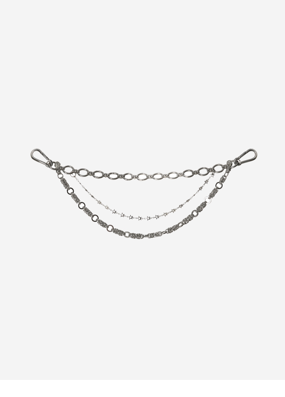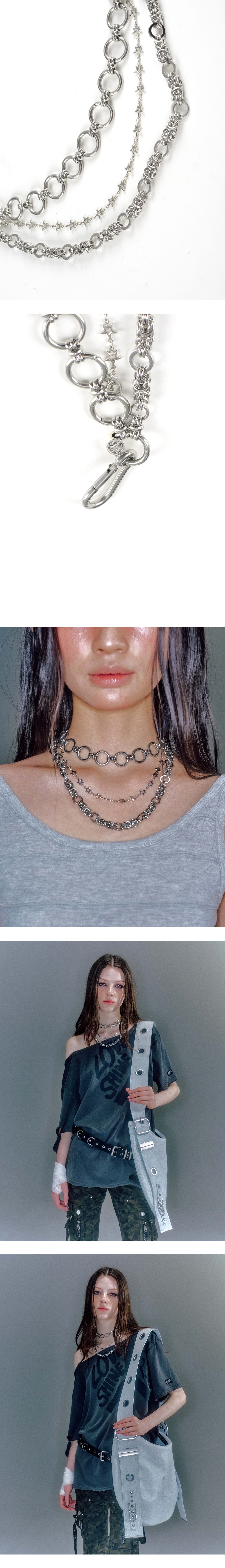 - 3가지 디자인의 체인 레이어드한 키링 - 체인/초커 등 다양한 스타일링 연출 - 써지컬 스틸과 브라스 금속의 소재 믹스