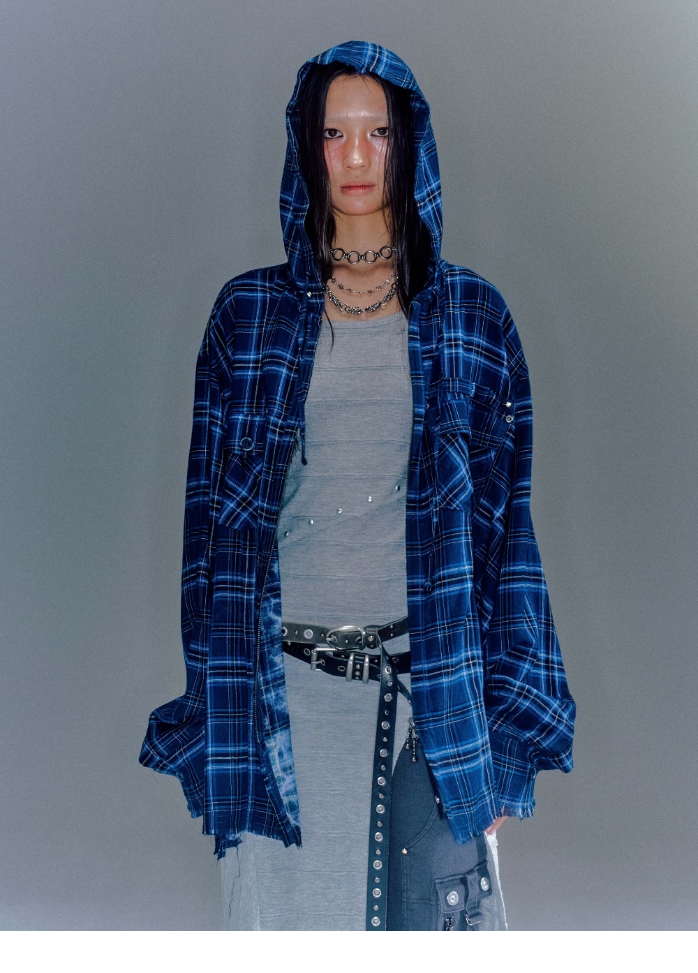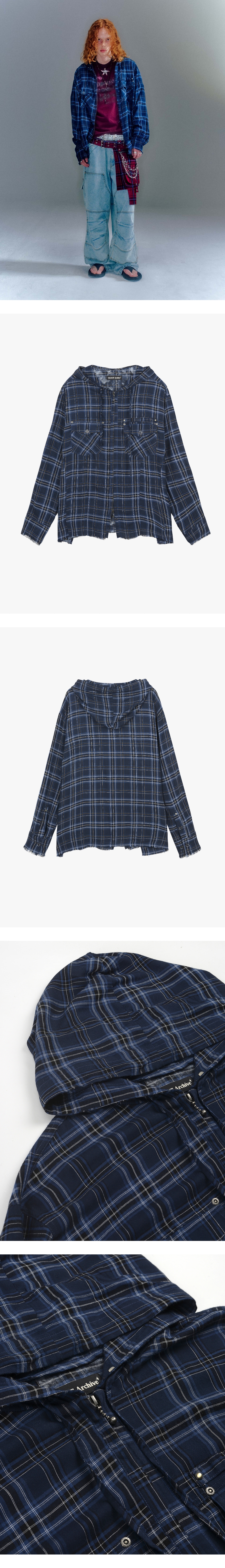 - 와이드 실루엣의 체크 후드 셔츠 - 얇은 두께감에 흐르는 실루엣 - 안쪽에 나염 가공이 들어간 소재 사용 - 내추럴한 밑단 컷팅 가공 디테일 - 베이컨트 제작 리벳 사용