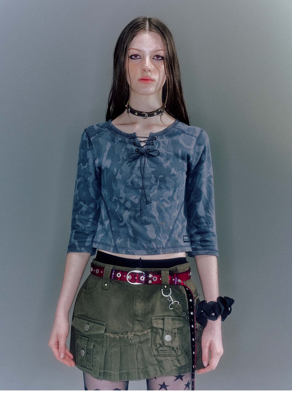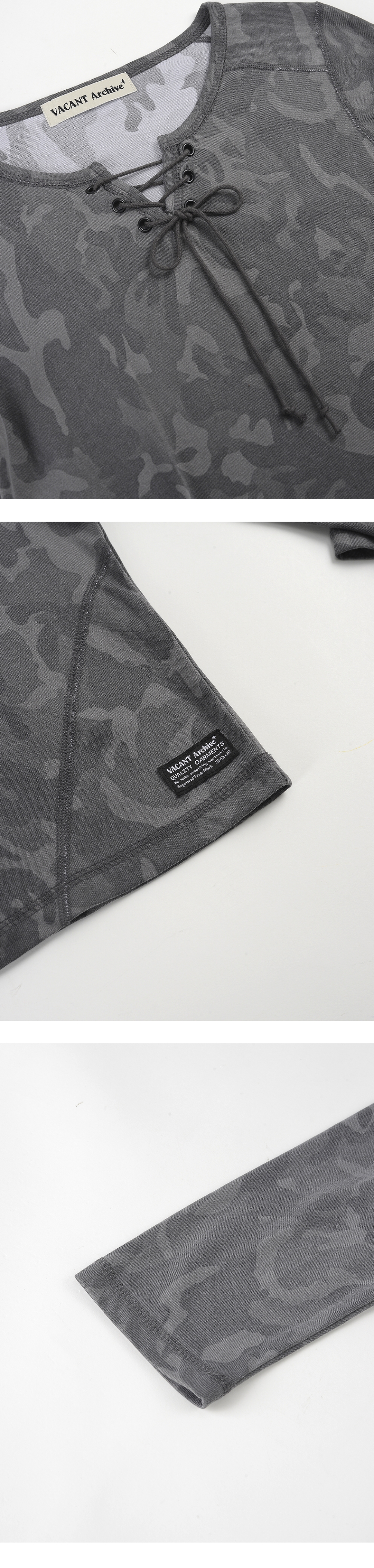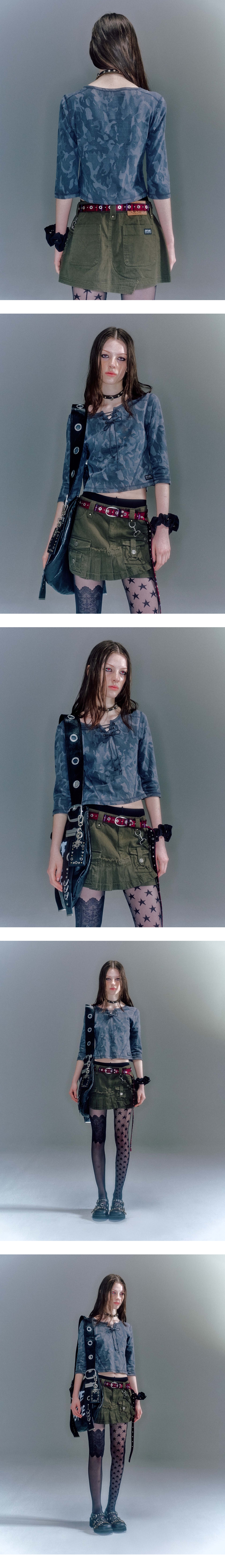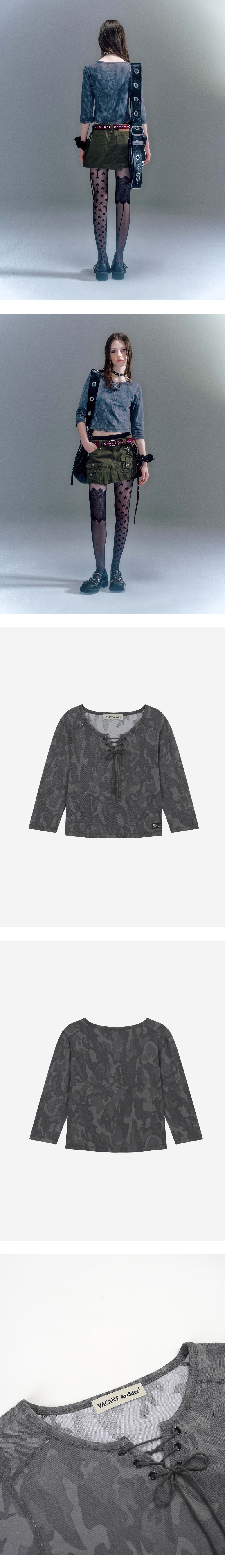- 슬림핏 7부 소매 티셔츠 - 앞판 레이스업 디테일 포인트 - 웨이스트 라인을 따라 들어간 오드람프 절개선 포인트 - 빈티지한 카모 플라쥬 패턴으로 빈티지하고 스트리한 감성 연출
