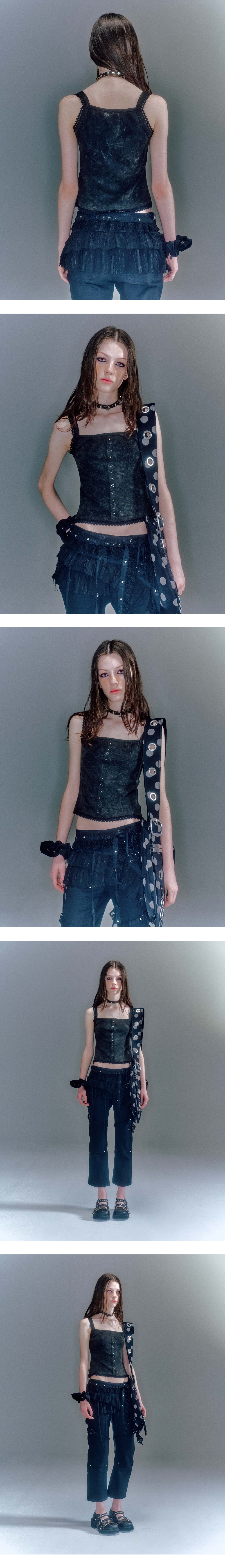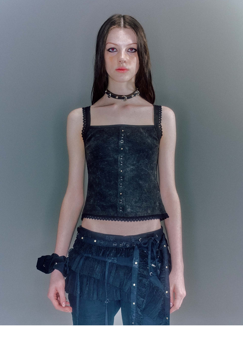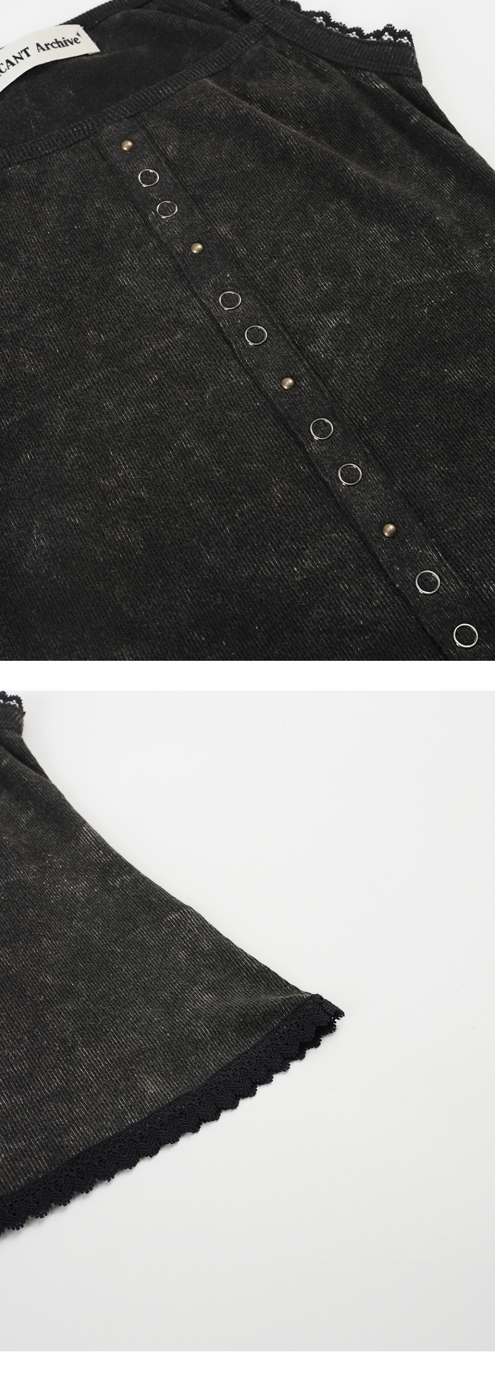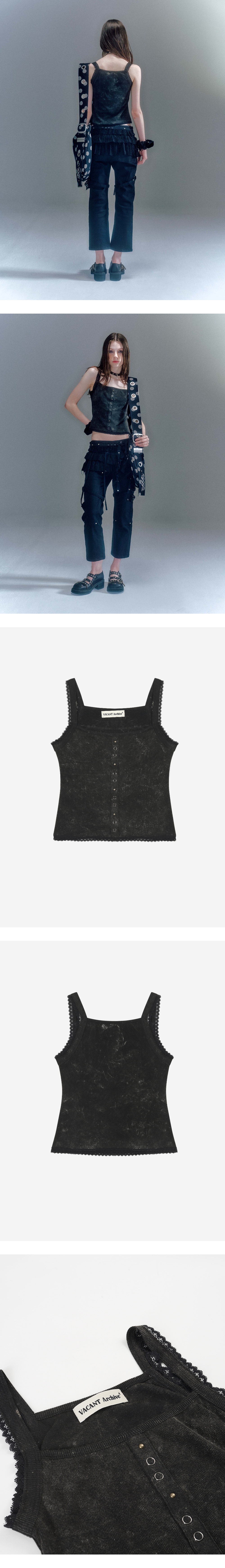 - 물나염 워싱 가공된 원단으로 빈티지한 무드 연출 - 프론트 핫픽스와 가시스냅 디테일로 시크한 무드 연출 - 어깨 끈과 밑단에 레이스 디테일 - 이중 스티치로 완성도 높은 마감 처리