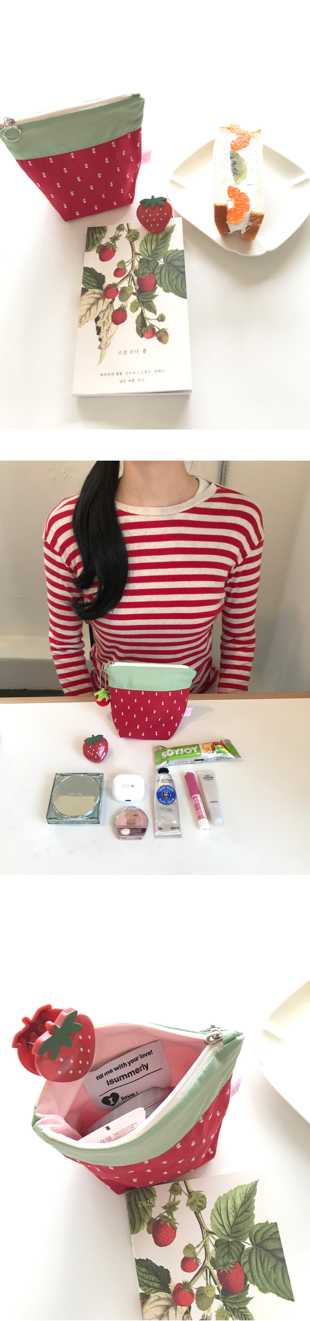 딸기 파우치 레드 색상은 3월 10일부터 출고되는 예약배송 제품입니다. 구매에 참고 부탁드립니다. 귀여운 딸기 모양을 모티브로 제작하였습니다. 바닥면이 있는 파우치로, 간단한 소지품을 수납하기 유용합니다.
