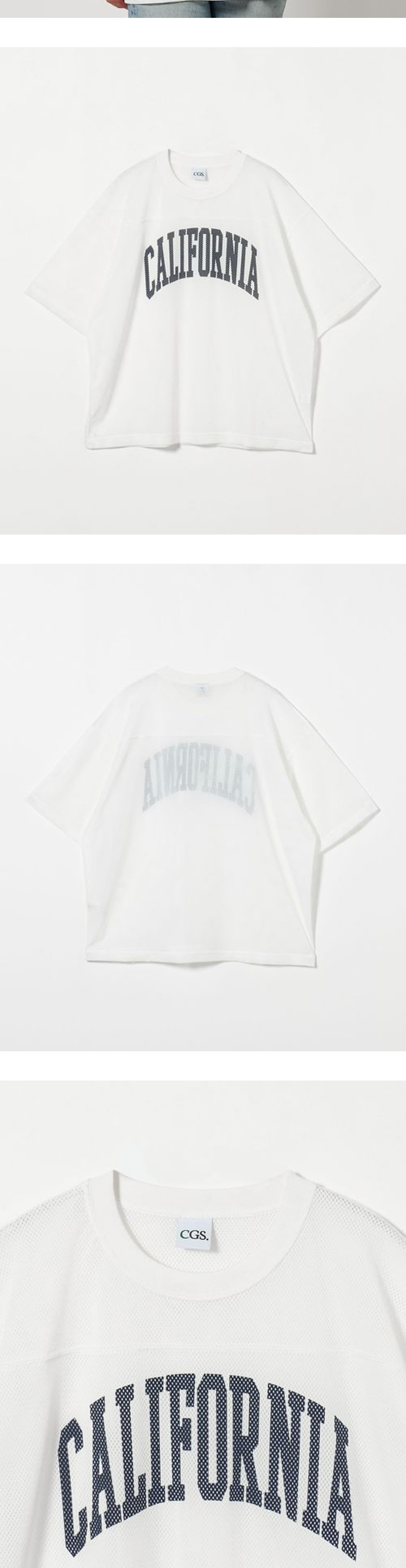 레이어드로 다양하게 활용 가능한 캘리포니아 제너럴 스토어 아일렛 메쉬 크루 넥 티셔츠 화이트입니다. - 중앙에 CALIFORNIA 로고 프린트 - 메쉬 소재 - 오버사이즈 실루엣