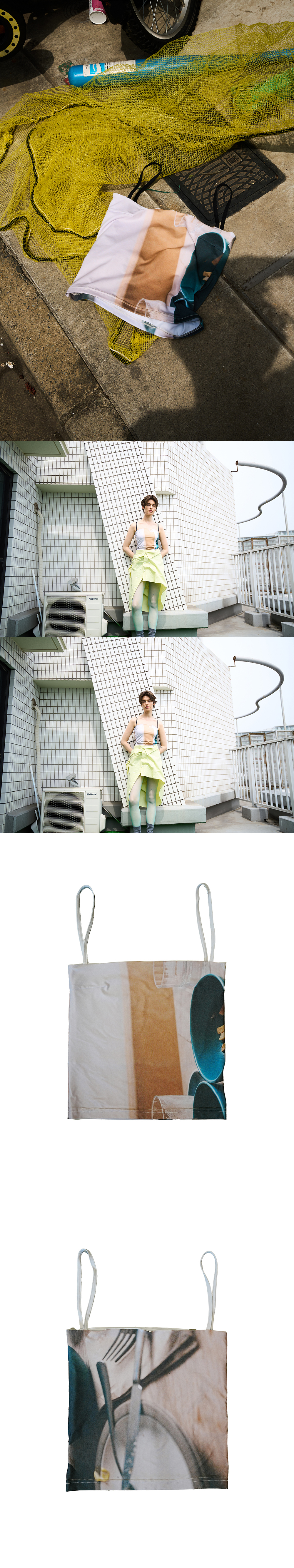 DETAIL Cropped Sleeveless top Photo printed throughout Soft-touched cooling fabric 크롭 슬리브리스 탑 포토 프린팅 부드러운 터치감의 쿨링 패브릭 COMPOSITION Polyester 98% Span 2% SIZE MEASUREMENT - Size OS : Length 27cm_Chest 31cm_Strap 16cm Made in S o u t h Korea WASHING INSTRUCTIONS Dry clean recommended Hand wash cold Wash separately Do not bleach