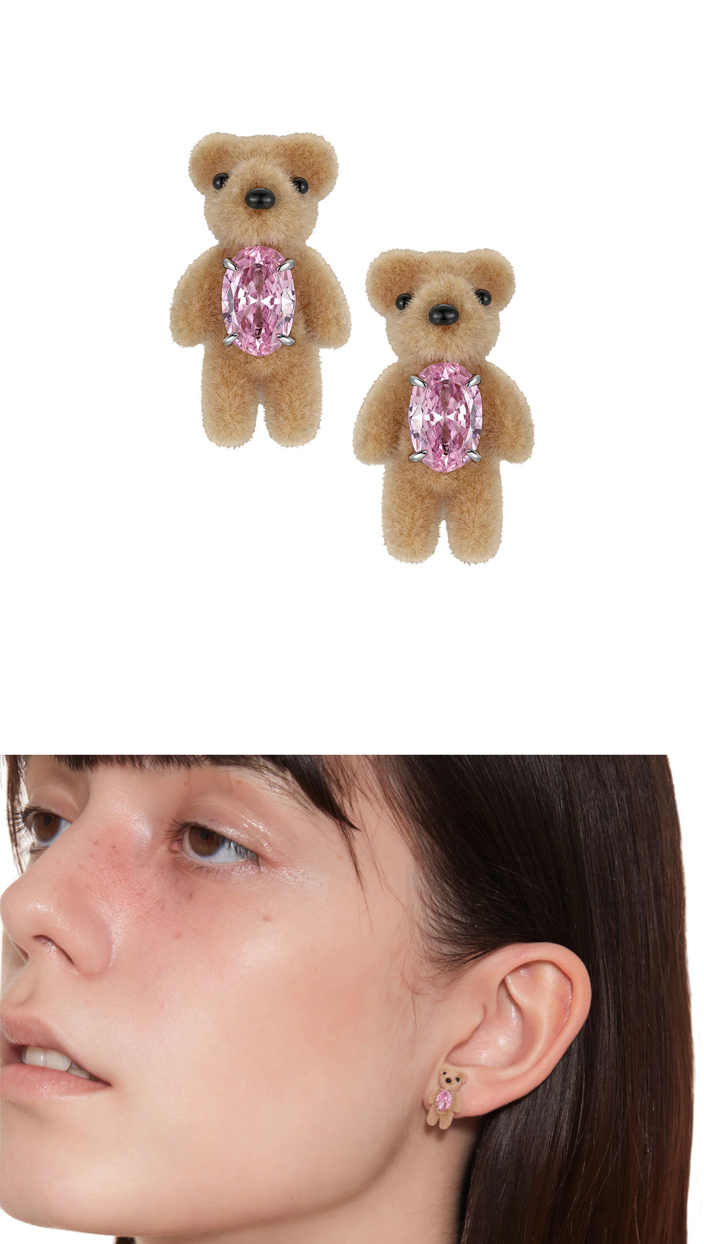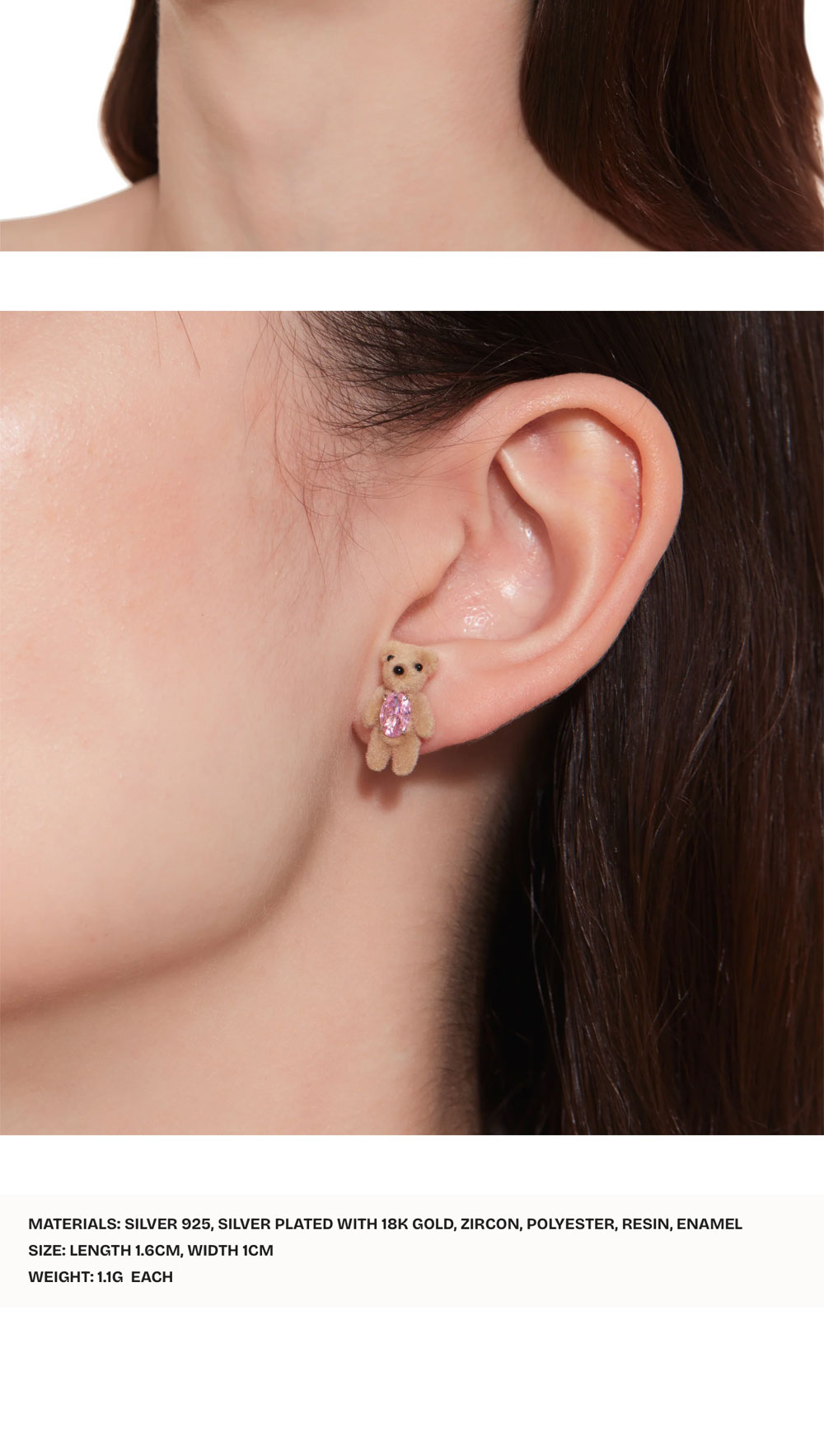 핑크색 지르콘 보석을 가슴에 품고 있는 곰돌이 장식의 이어링입니다. - "쥬얼리에 새긴 옷"의 의미를 담은 Paradise 컬렉션 - 부드러운 벨벳 소재로 만들어진 브라운 컬러의 곰돌이 인형 | 사이즈 가이드 | - 무게: 각 1.1g