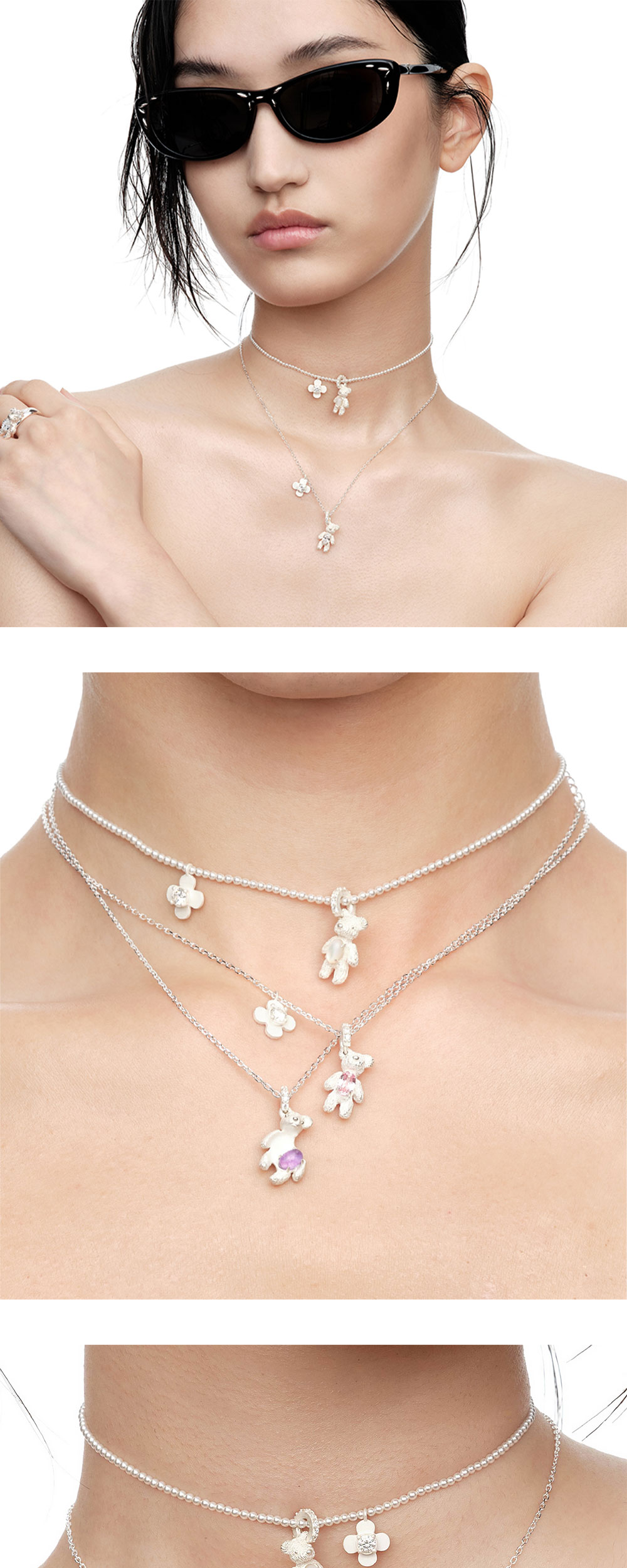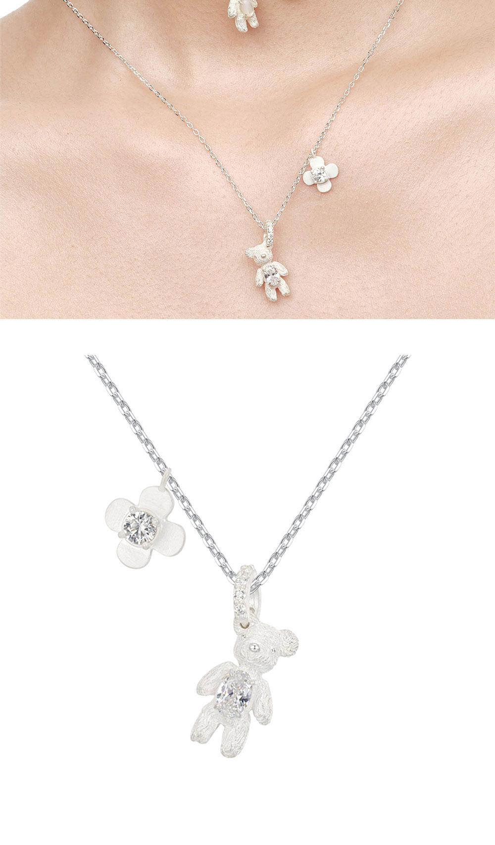 메탈 미니 베어가 포인트가 되는 위민의 카브드 메탈 미니 베어 펜던트 화이트 컬러입니다. - 플라워 장식 - 메탈 미니 베어 디자인 - 가슴에 화이트 지르콘 보석을 품고 있는 디자인 - 미니 베어 귀에 박힌 피어싱 장식