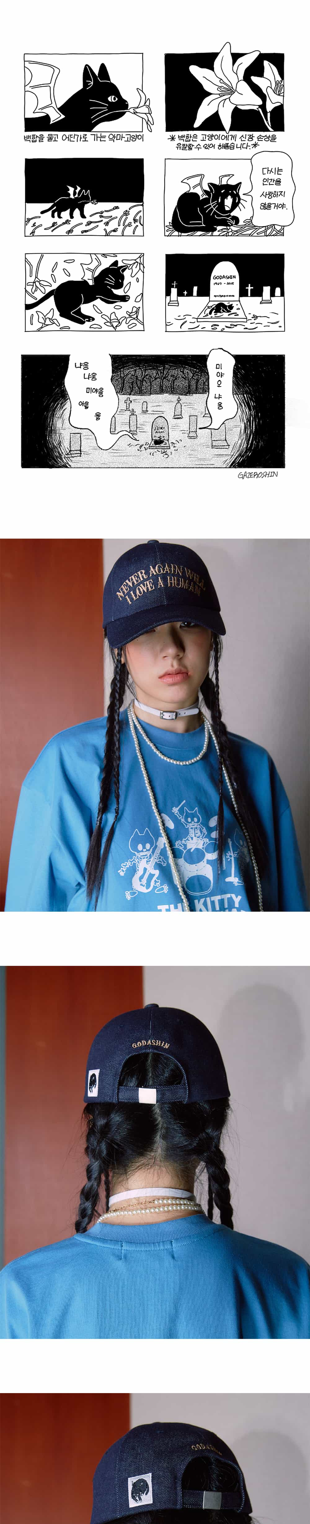 “다시는 인간을 사랑하지 않을 거야.” Gazeroshin, 『악마 고양이』 만화 중 영원한 삶을 사는 악마 고양이가 먼저 떠난 주인을 그리워하며 외치는 대사를 담았습니다. - 6 패널, 6 아일렛 - 전후면 자수 - 측면 패치 디테일 - Cotton 100% - Made in KOREA * 데님 원단 특성상 물빠짐이 발생할 수 있으니 반드시 단독 세탁해 주세요. *