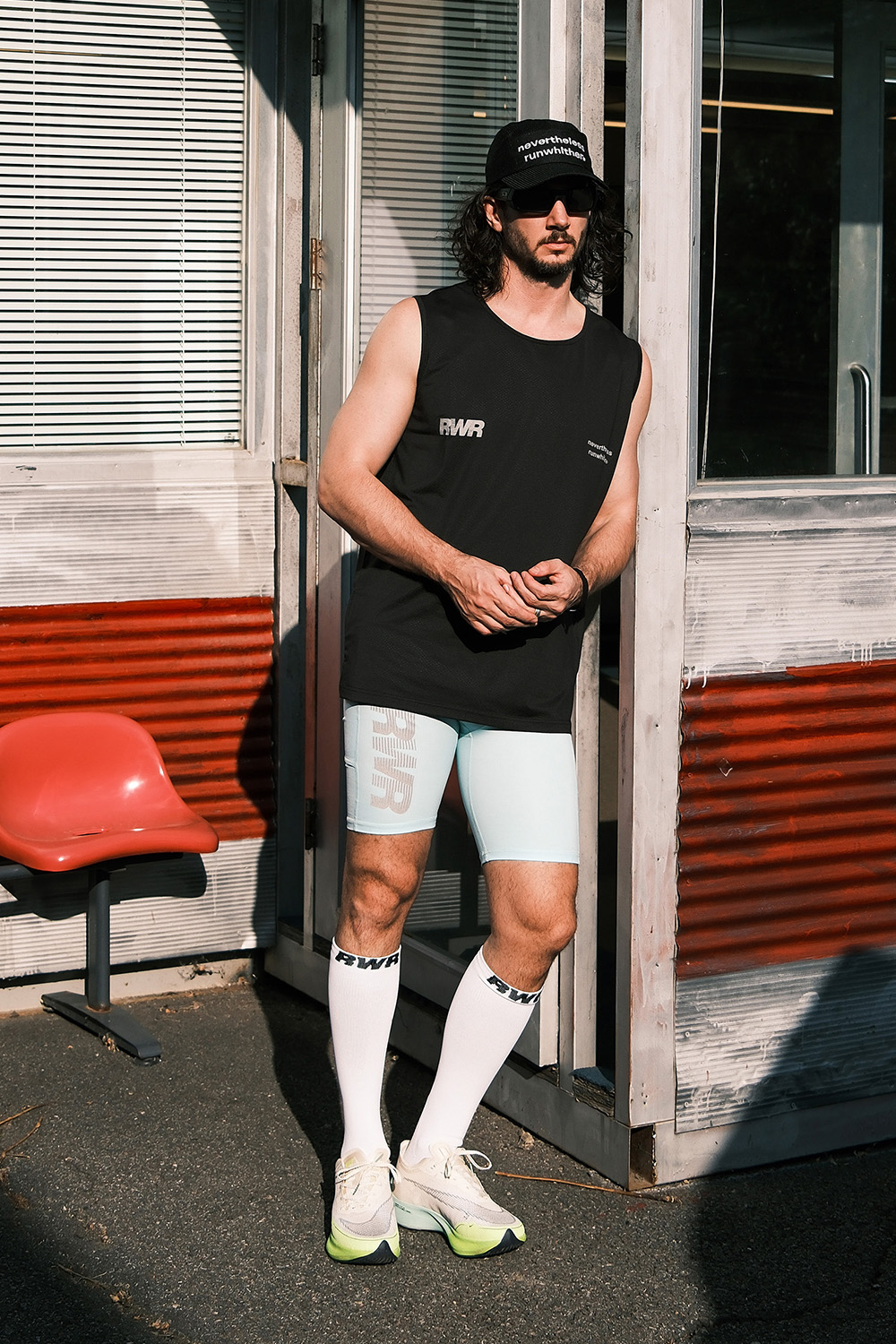오른쪽 허벅지에 위치한 리플렉터 전사는 빛에 반사되어 어두운 환경에서도 러너의 존재감을 강조하며,