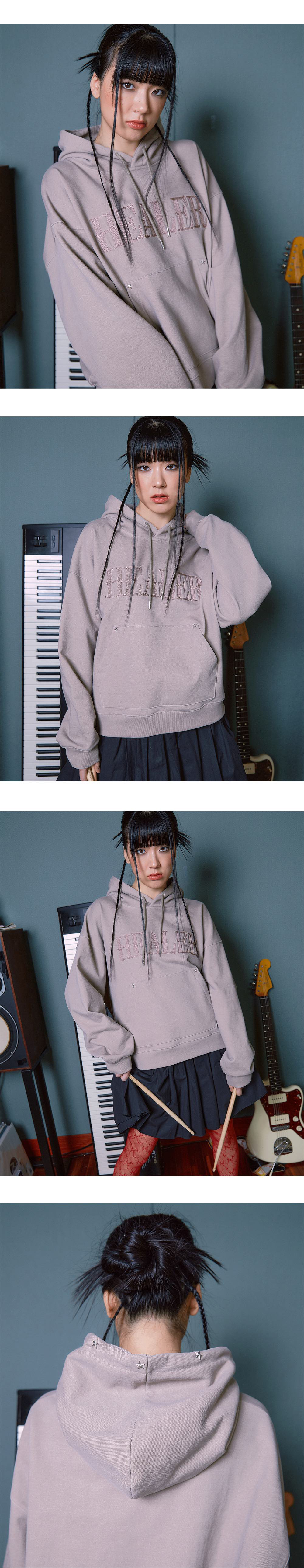 Comment 음악을 통해 치유받는 사람들을 떠올리며 ‘HEALER’라는 슬로건을 담았습니다. - Cropped Loose Fit - 피그먼트 다잉 원단 - 전면 체인 자수 - 후디 & 캥거루 주머니 별 리벳 디테일
