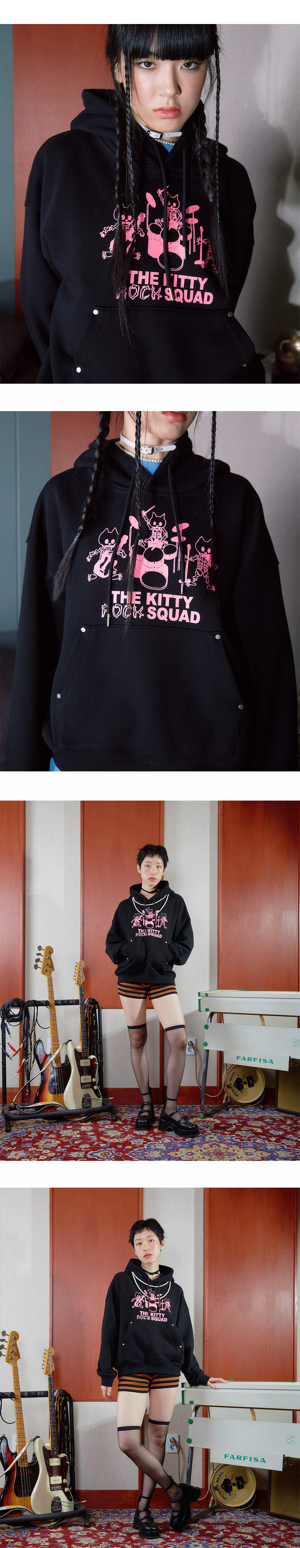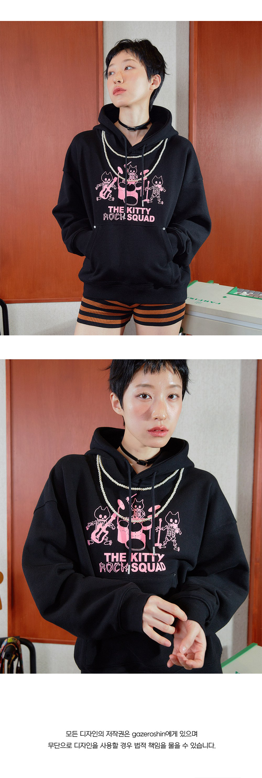 Comment 시간이 지나도 빛을 잃지 않는 뮤지션의 음악적 유산을 재해석 보았습니다. 그들이 남긴 멜로디는 사라지지 않고 세대를 넘어 많은 이들의 마음 속에서 오래 울려 퍼집니다. 영원히 기억되는 그들의 멜로디처럼 자유롭게 연주하며 감동을 전하는 ‘키티 락 스쿼드’의 모습을 담았습니다. - Cropped Loose Fit - 전면 프린팅 - 캥거루 주머니 원형 리벳 디테일