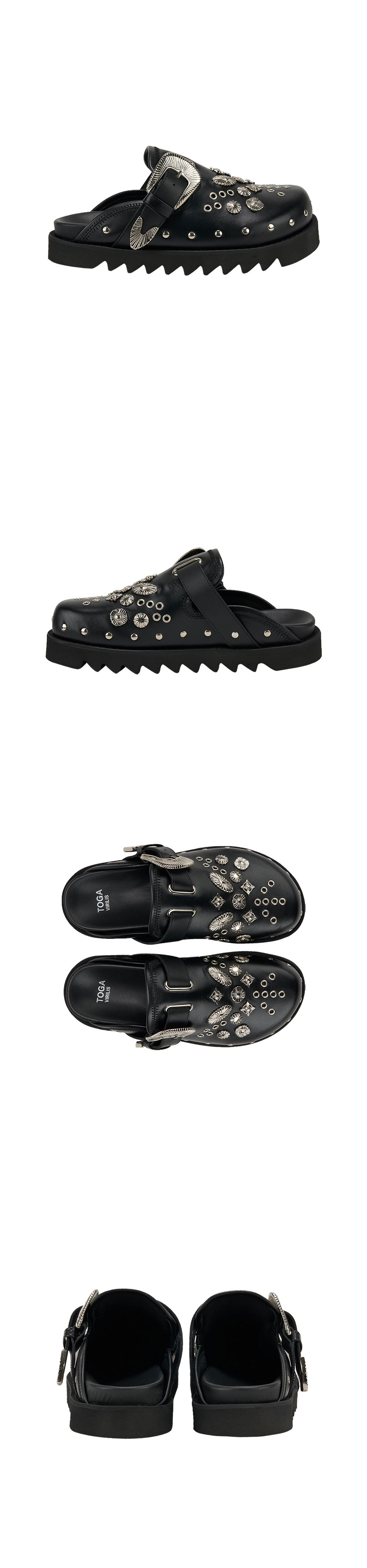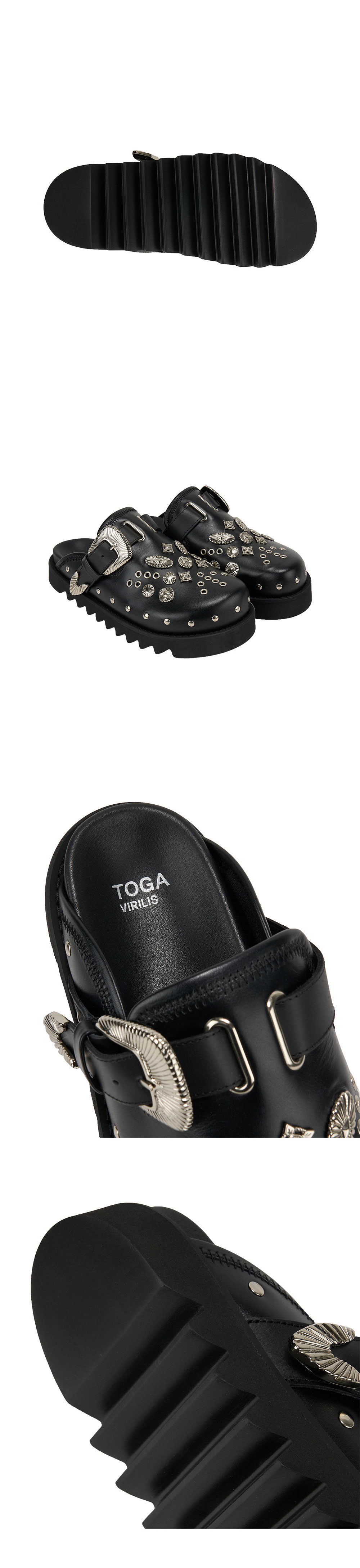 독보적인 메탈 스터드 디자인으로 존재감을 드러내는 토가의 비릴리스 AJ1066 레더입니다. - 어퍼 부분에 메탈 스터드, 메탈 아일렛 - 두께가 있는 샤크 솔 - 힐 2.5cm