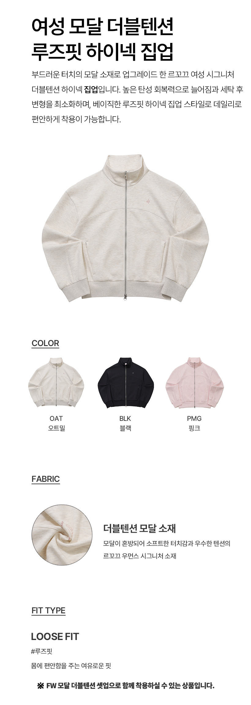 르꼬끄 스포르티브 여성 모달 더블텐션 루즈핏 하이넥 집업 - 핑크(QQ322OFT81)