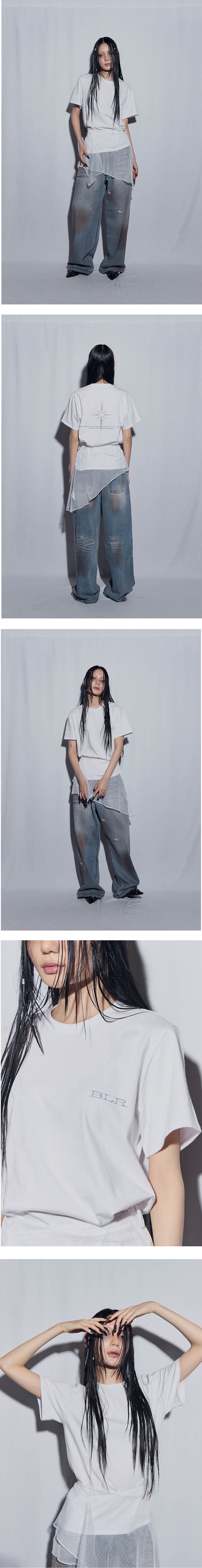 모자이크-블러 처리된 BLR 타이포 프린트가 포인트를 더하는 숏 슬리브, 여성용 오버핏 티셔츠로 여유롭고 편안한 착용감을 제공합니다. 유니크한 디테일과 넉넉한 핏이 스타일리시하면서도 실용적인 제품