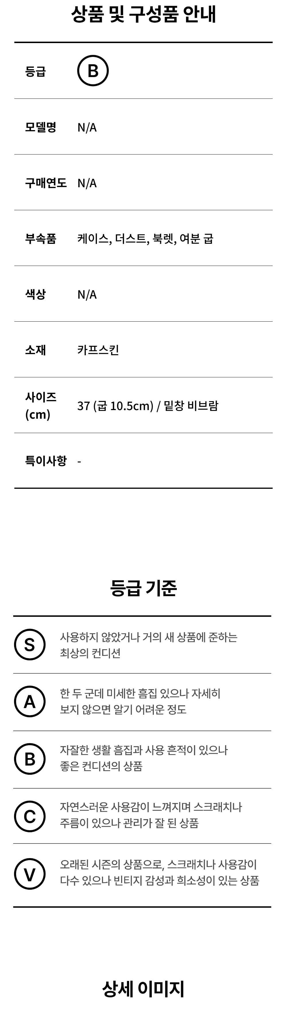 모든 상품(가죽, 의류, 잡화, 슈즈 등)은 사용자의 사용방법과 환경에 따라 변형, 변색이 될 수 있으니 반드시 취급 라벨에 표시된 관리 안내를 따르시길 권장 드립니다. 이는 정도의 차이가 있으며 과도한 체열과 땀, 습기, 빛, 마찰은 제품의 손상 및 변형을 일으킬 수 있으므로 주의하시길 바랍니다.