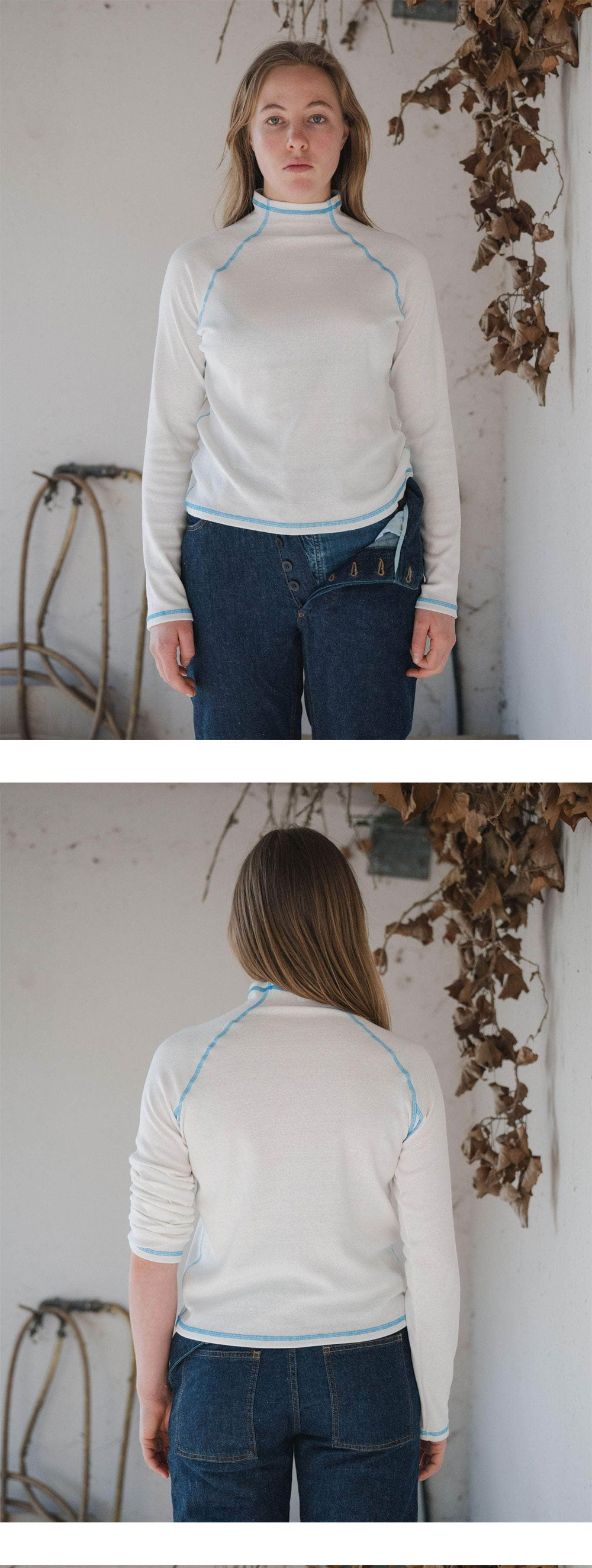 언다이드 블루 스티치 컬러가 매력적인 베이스레인지 캐스트 터틀넥입니다. -리사이클 코튼 -터틀넥 디자인 -겨드랑이 아래 인서트 *모델은 s사이즈를 착용했습니다.
