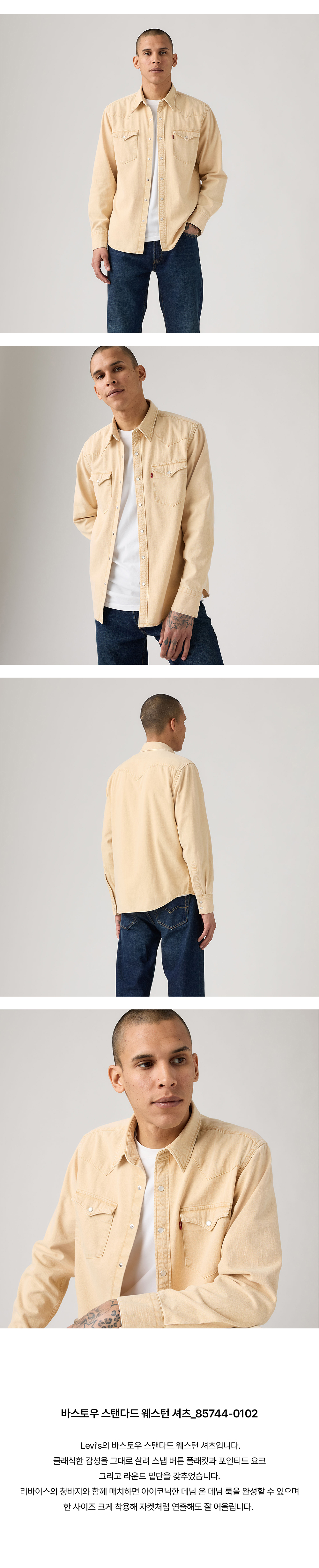 Levi's의 바스토우 스탠다드 웨스턴 셔츠입니다. 클래식한 감성을 그대로 살려 스냅 버튼 플래킷과 포인티드 요크 그리고 라운드 밑단을 갖추었습니다. 리바이스의 청바지와 함께 매치하면 아이코닉한 데님 온 데님 룩을 완성할 수 있으며 한 사이즈 크게 착용해 자켓처럼 연출해도 잘 어울립니다.