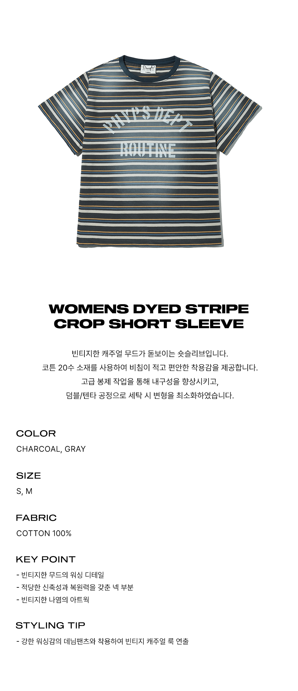 피지컬 디파트먼트 우먼즈 다잉 스트라이프 크롭 반팔티셔츠 차콜