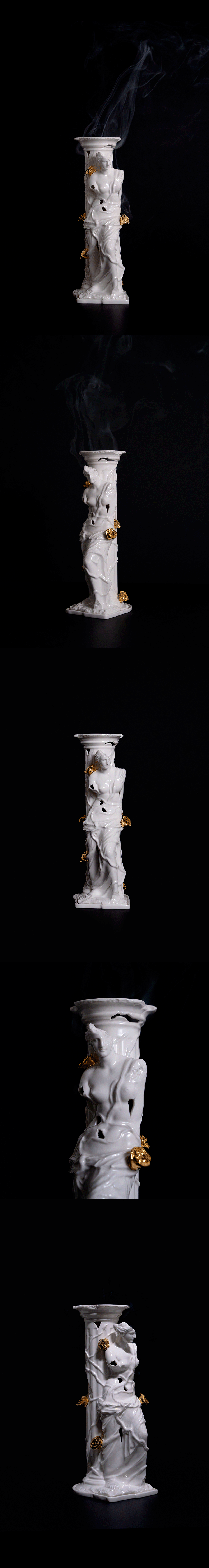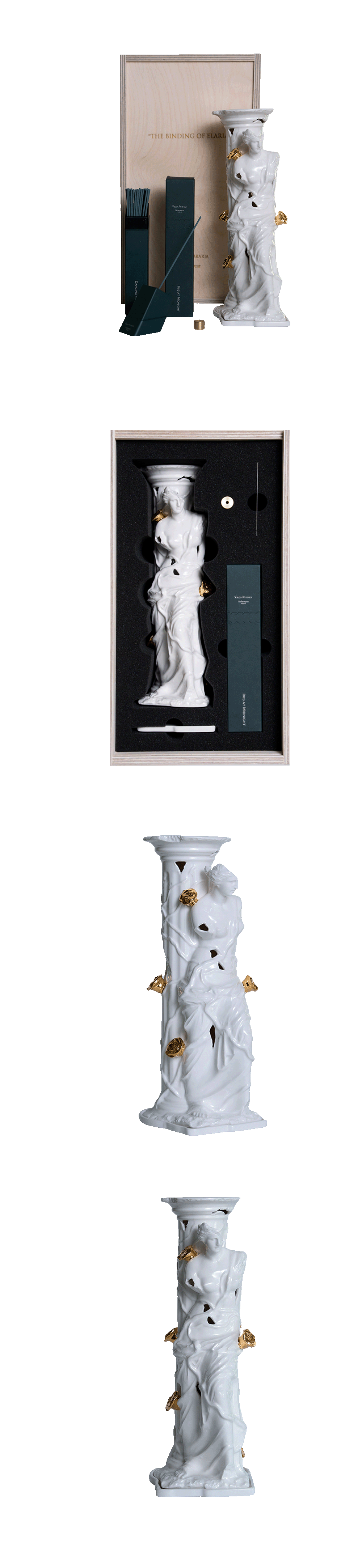 The Binding of Elaria Chamber package 무너진 여성 조각상 위로 금장미가 피어난 형태의 오브제형 챔버. 예술적 조형미와 상징성을 담아 향을 더욱 특별하게 즐길 수 있는 스페셜 패키지입니다. 패키지에는 넘버링이 되어있는 제품카드, 인센스 스틱 2종 (Iris at Midnight, Dancing Morning), 황동 홀더가 같이 제공됩니다.