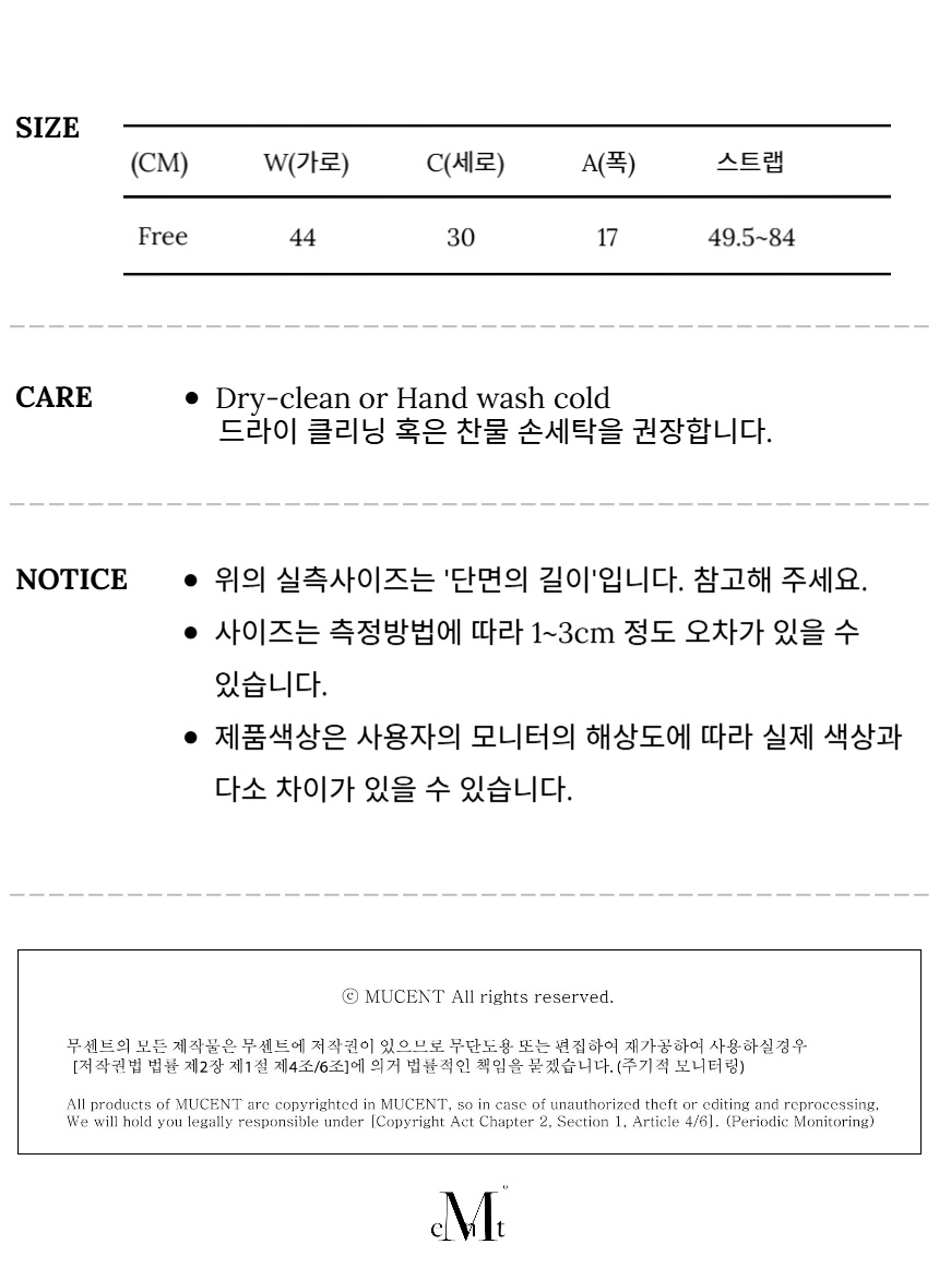 ┃Detail • 무센트 시그니처 메탈 로고 포인트 • 끈 길이를 조절하여 숄더, 크로스백 모두 착용 가능 • 은은한 광택감의 크로스백 • 넉넉한 사이즈감으로 소지품 수납 용이 • 지퍼 여밈으로 안전한 수납 • 데일리게 착용 가능한 아이템 ┃Material : Polyurethane 100% ┃Care : Dry cleaning - 무센트는 말기의 행성인 이 지구에서 지속 가능한 옷들을 고민합니다. 우리는 신념을 소비하는 미닝아웃을 지지합니다.