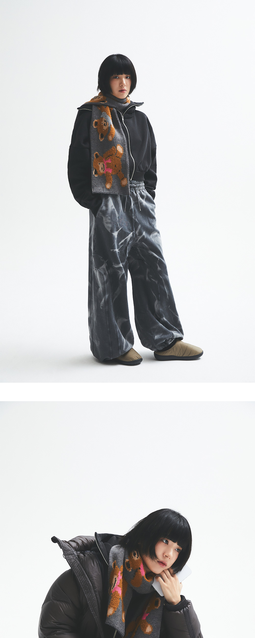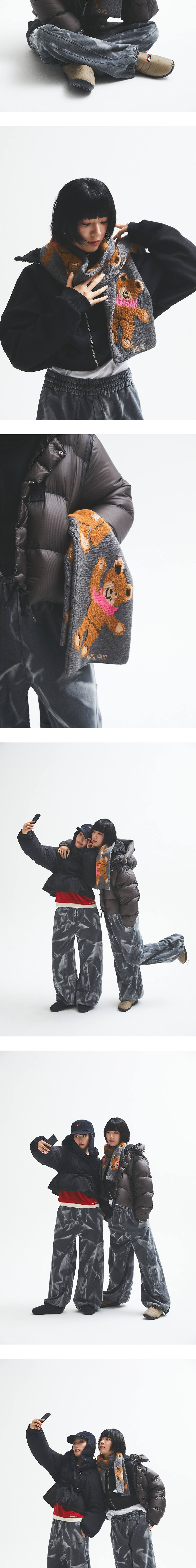 곰돌이 자수가 포인트가 되는 마리아노 오르세티 스카프 헤이즐넛 컬러입니다. -자카드 니트 스카프 -70% 울