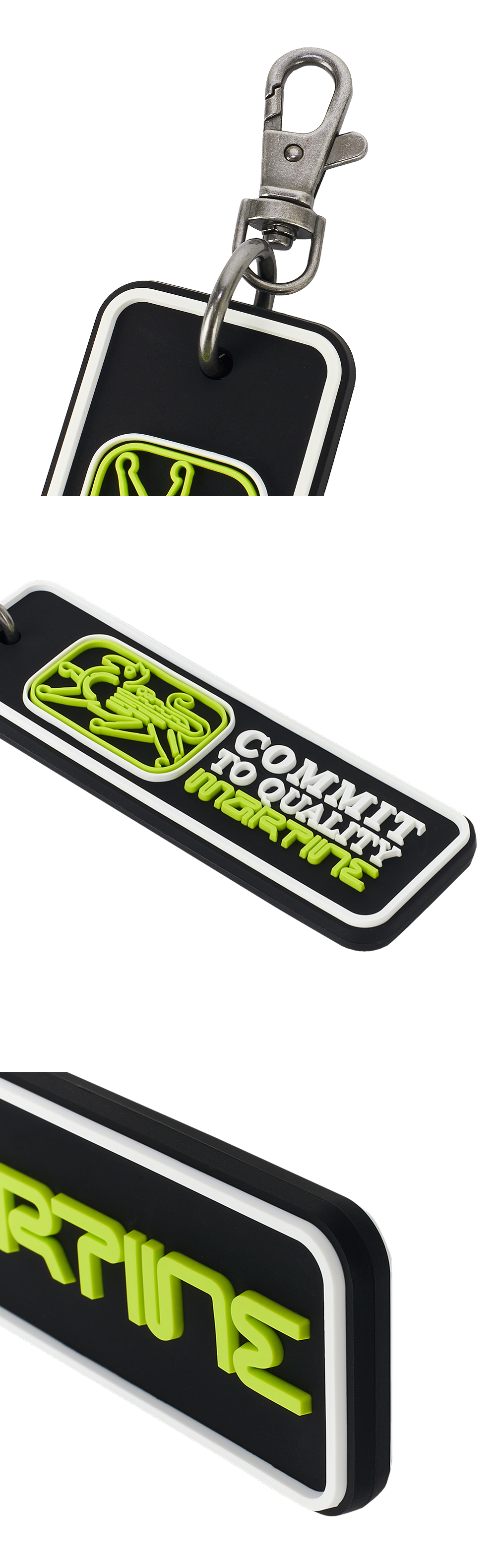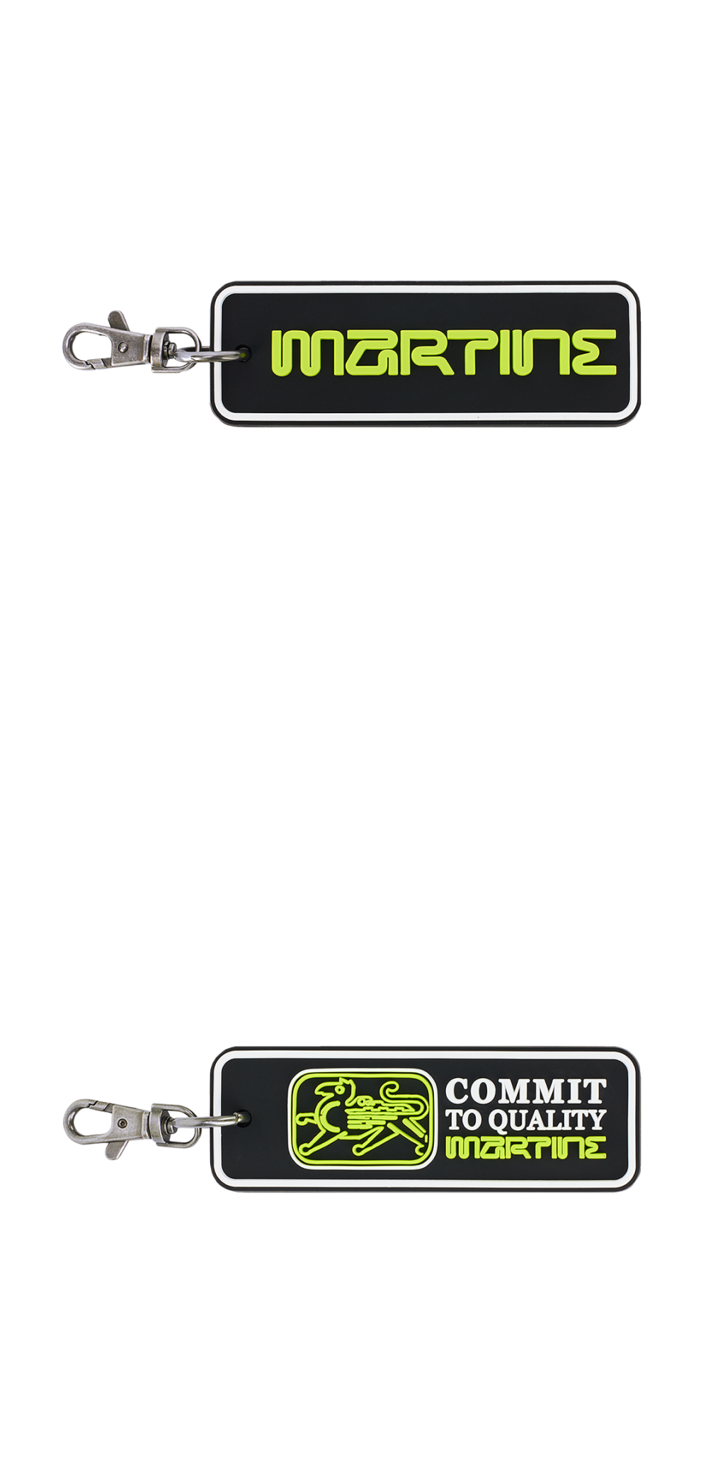 강렬한 색상 대비가 포인트인 마틴 로즈 실리콘 키체인 블랙 컬러입니다. - 전면 블랙 배경에 형광 라임 그린 컬러의 'MARTINE' 로고 - 실리콘 소재 - 메탈 카라비너 클립