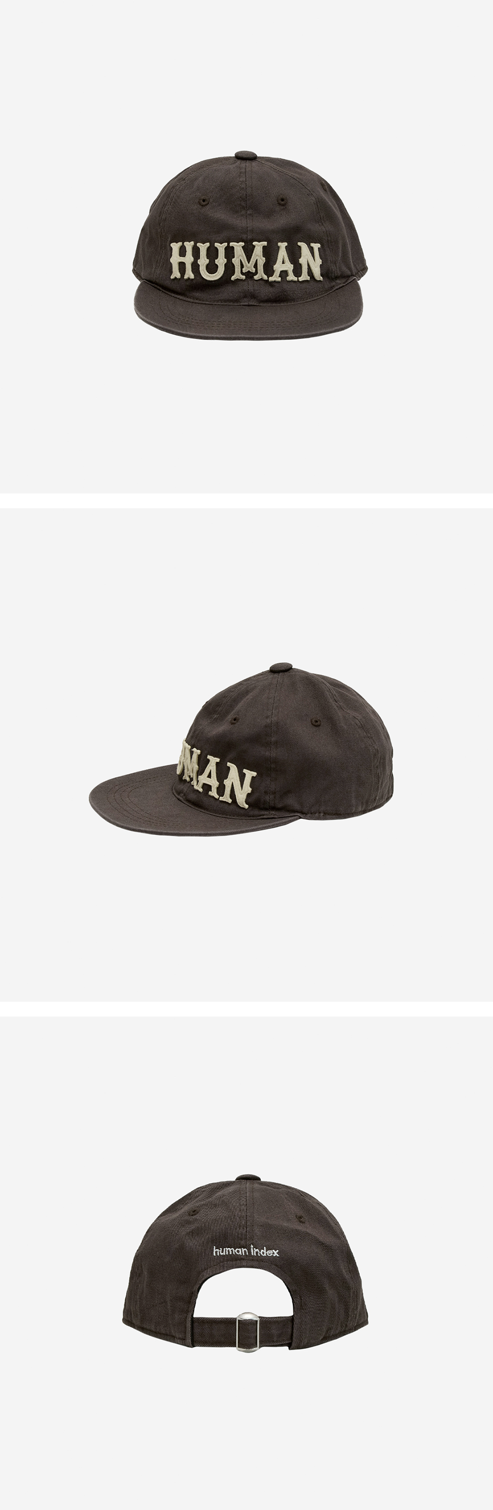 Human Cap (Idiot Fit) * 낮은 실루엣의 빈티지 캡을 재해석한 볼캡 * 전면 "HUMAN' 아플리케 패치 * 빈티지한 워싱 마감 * 사이즈 조절 끈으로 둘레 조정 가능 * 기본 출고시 약간만 구부려진 일자챙이지만, 수령 후 선호에 맞게 챙을 구부려 연출 가능 *모델: 170 초반 / 마른 체형