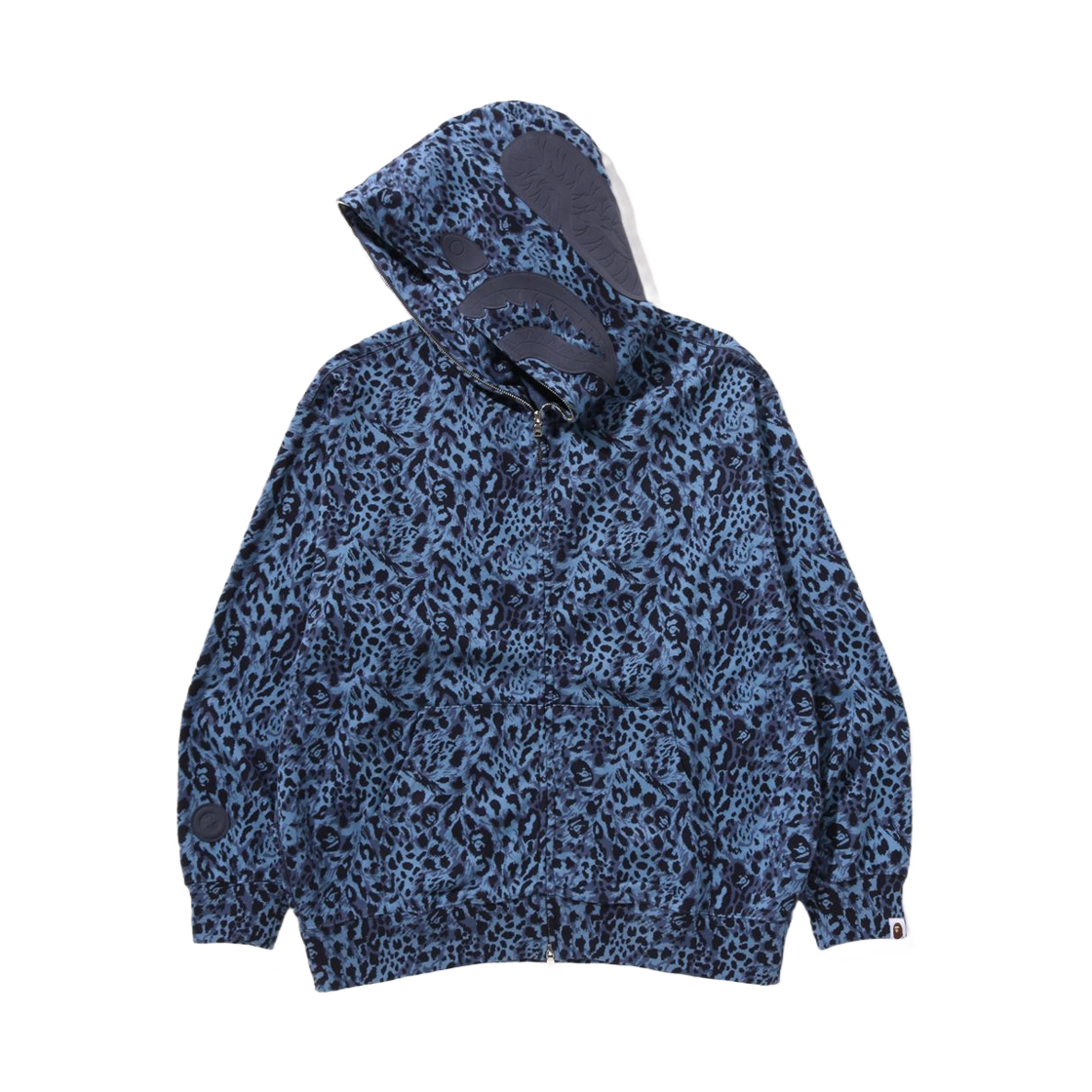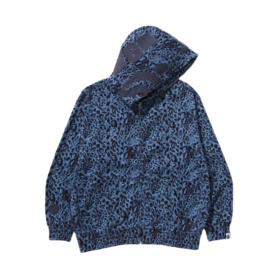 베이프 와일드 레오파드 패턴 샤크 릴렉스드 핏 풀 집 후드 네이비