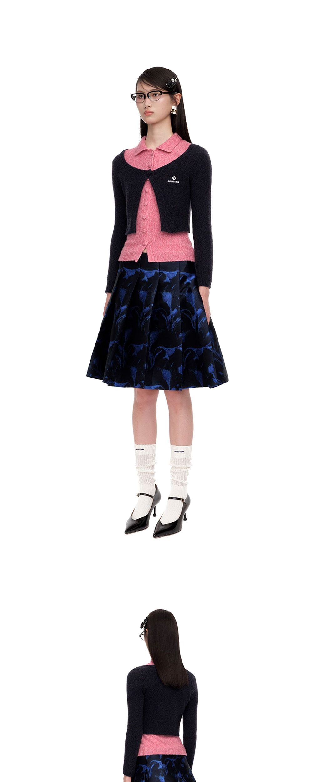 레이어링 연출에 최적화된 슈슈통 우먼 싱글 버튼 가디건 네이비 블루입니다. - 싱글버튼 여밈 - 깊게 파인 둥근 넥라인 - 전면 가슴 부분 로고 디테일