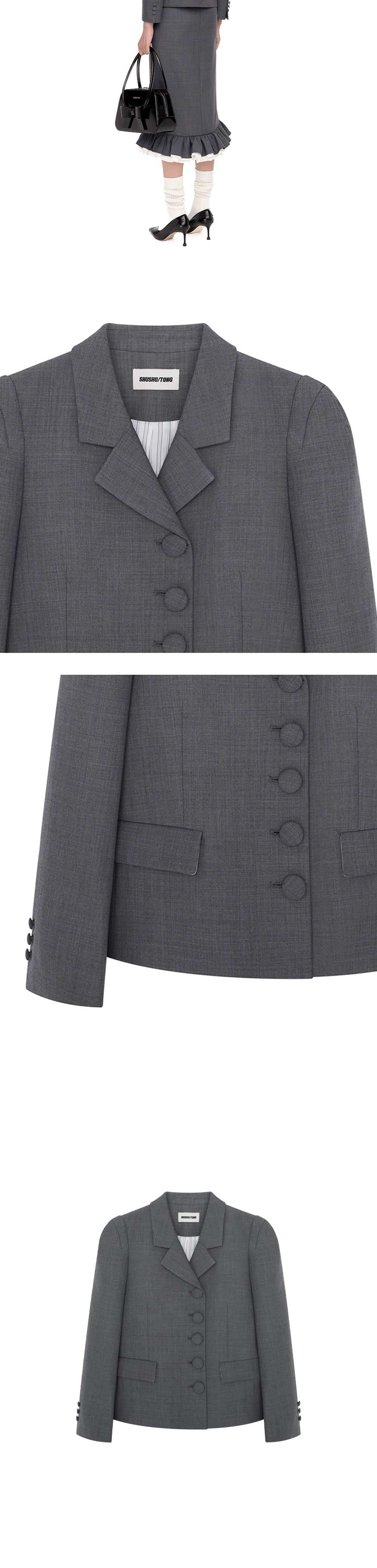 클래식한 무드에 정교한 디테일을 더한 슈슈통 우먼 라펠 숏 자켓 그레이입니다. - 어깨 라인에 절개선을 더해 입체적인 볼륨감을 강조함 - 전면에는 5개의 버튼 여밈으로 클래식한 디테일을 더함 - 크롭 기장으로 구조적인 실루엣을 완성한 디자인
