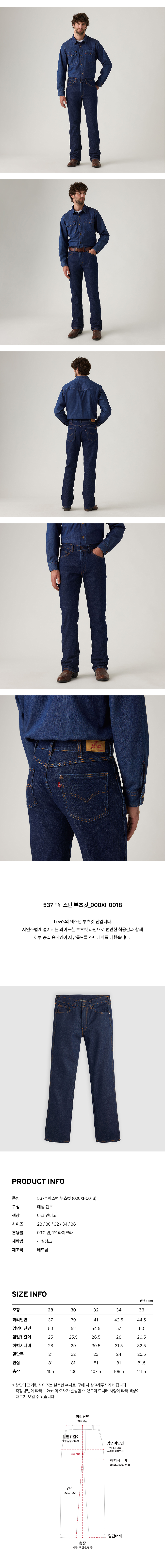 Levi's의 웨스턴 부츠컷 진입니다. 자연스럽게 떨어지는 와이드한 부츠컷 라인으로 편안한 착용감과 함께 하루 종일 움직임이 자유롭도록 스트레치를 더했습니다.