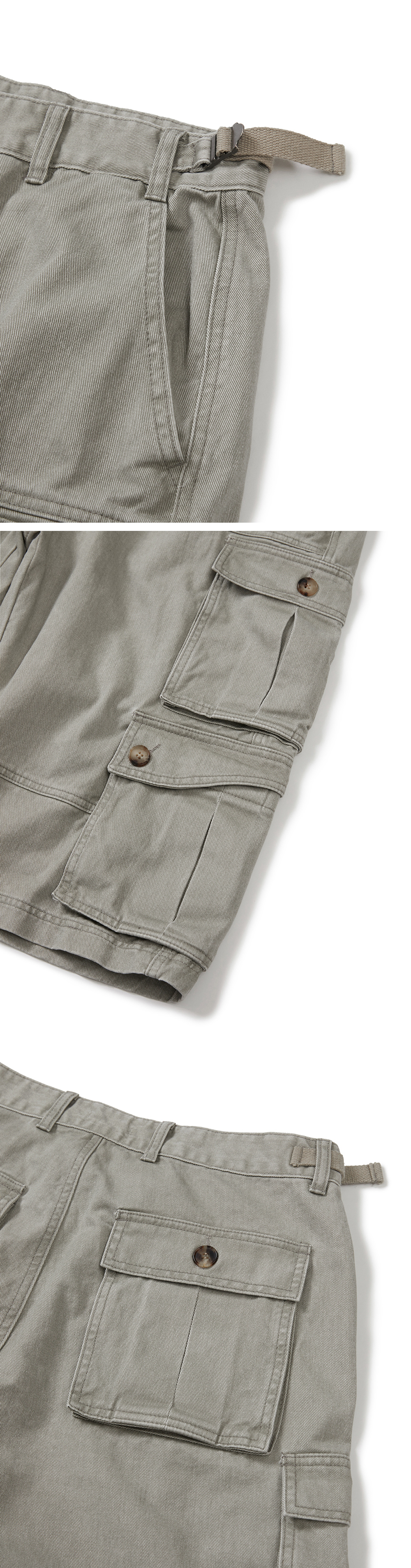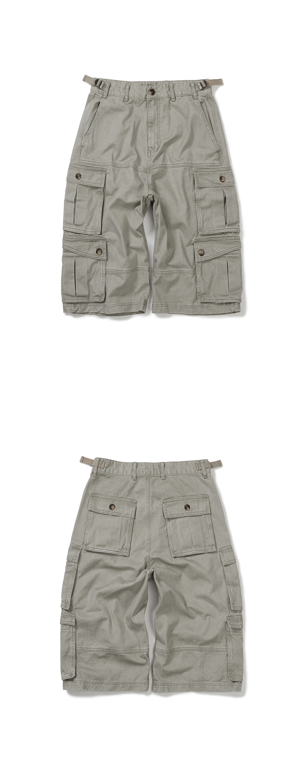Product Info. - 고품질 카치온 코튼 원단으로 제작 후, 가먼트 워싱 공정을 거쳐 빈티지한 텍스처의 버뮤다팬츠 - 여유 있게 떨어지는 와이드 한 실루엣, 7부 기장감 - 프런트 2개의 핸드 포켓, 사이드와 백 위치 6개의 입체감 있는 형태의 카고 포켓 디자인 - 구조적인 형태의 전/후면 절개 디테일 - 사이드 하단 카고 포켓 곡선 형태의 플랩 디자인 포인트 - 허리 사이즈 조절 가능한 양 사이드 웨빙 어드저스터 디테일 - Real Cow Horn Button 사용 - YKK 지퍼 사용