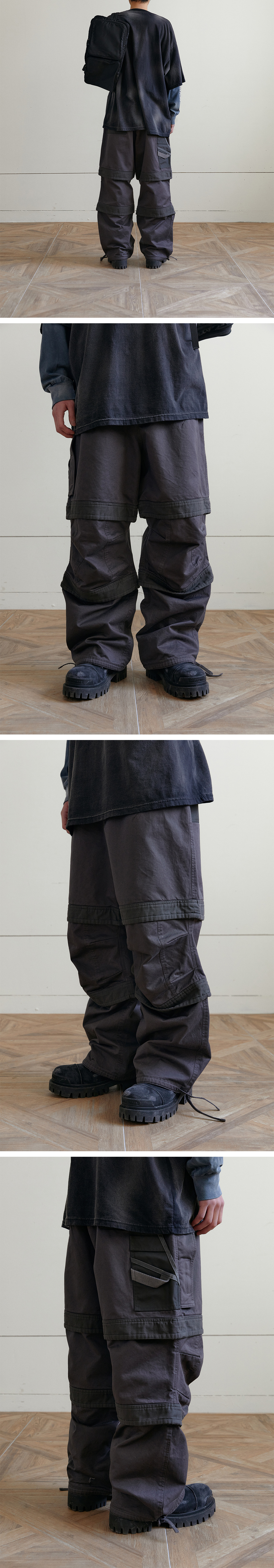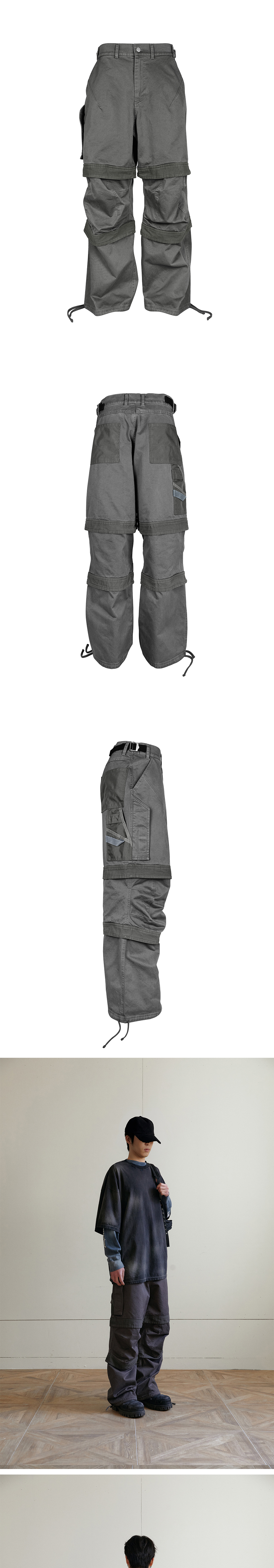 밀리터리 감성과 실용성을 모두 담은 레이어드 워크 팬츠입니다. 상단은 반바지, 하단은 루즈핏 롱 팬츠가 결합된 독창적인 디자인으로 한 벌로도 다양한 스타일을 연출할 수 있습니다. 무릎 절개 라인과 자연스럽게 잡히는 주름 디테일이 입체적인 실루엣을 완성하며 활동성을 높여줍니다. 견고한 워크웨어 원단을 사용해 오래도록 착용 가능하며, 차분한 차콜 컬러가 어떤 룩에도 자연스럽게 어울립니다.