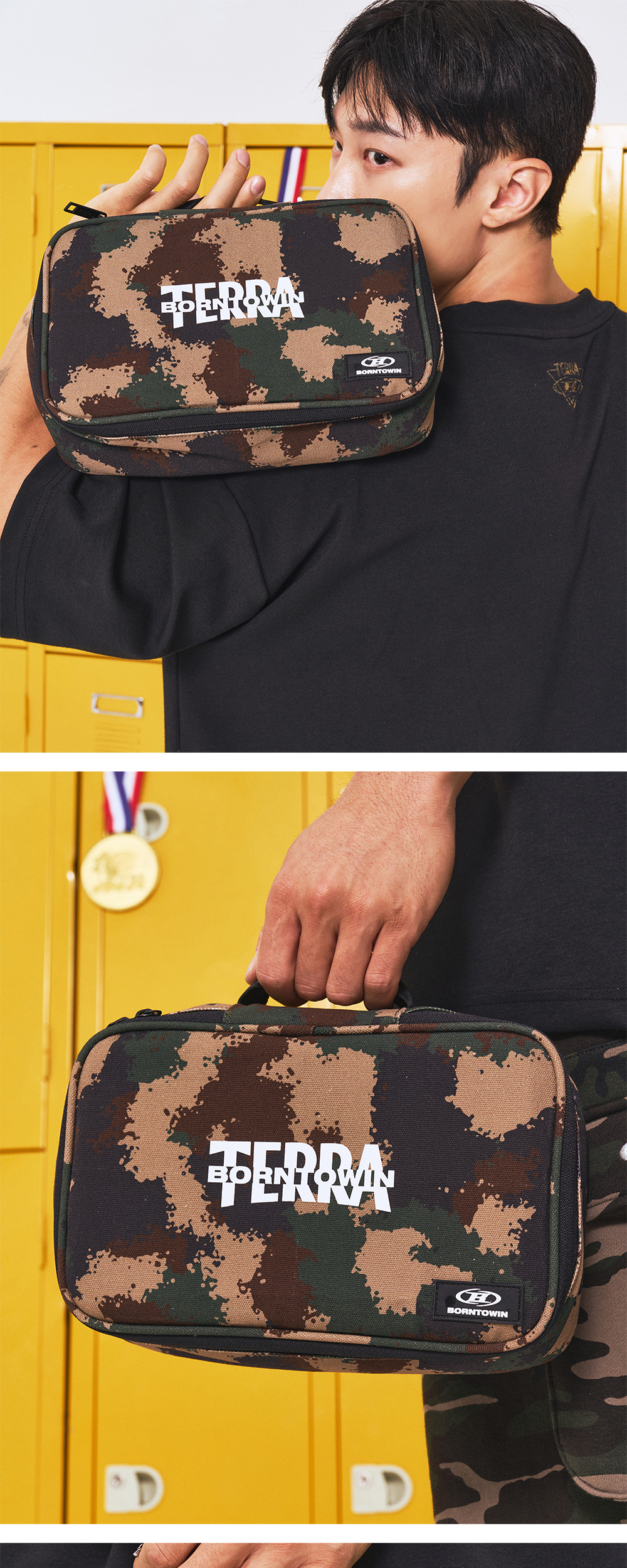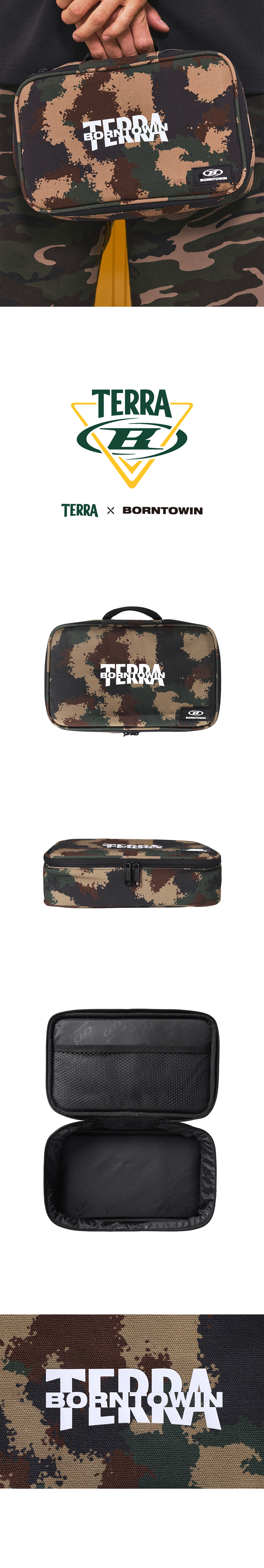 [DETAILS] * 본투윈 X 테라 카모 파우치 - 내구성 좋은 캔버스 원단 - 테라와의 협업을 기념하는 스페셜 그래픽 포인트 - 2-WAY 지퍼 - 내부 메쉬 미니 포켓 Material : Cotton 100%