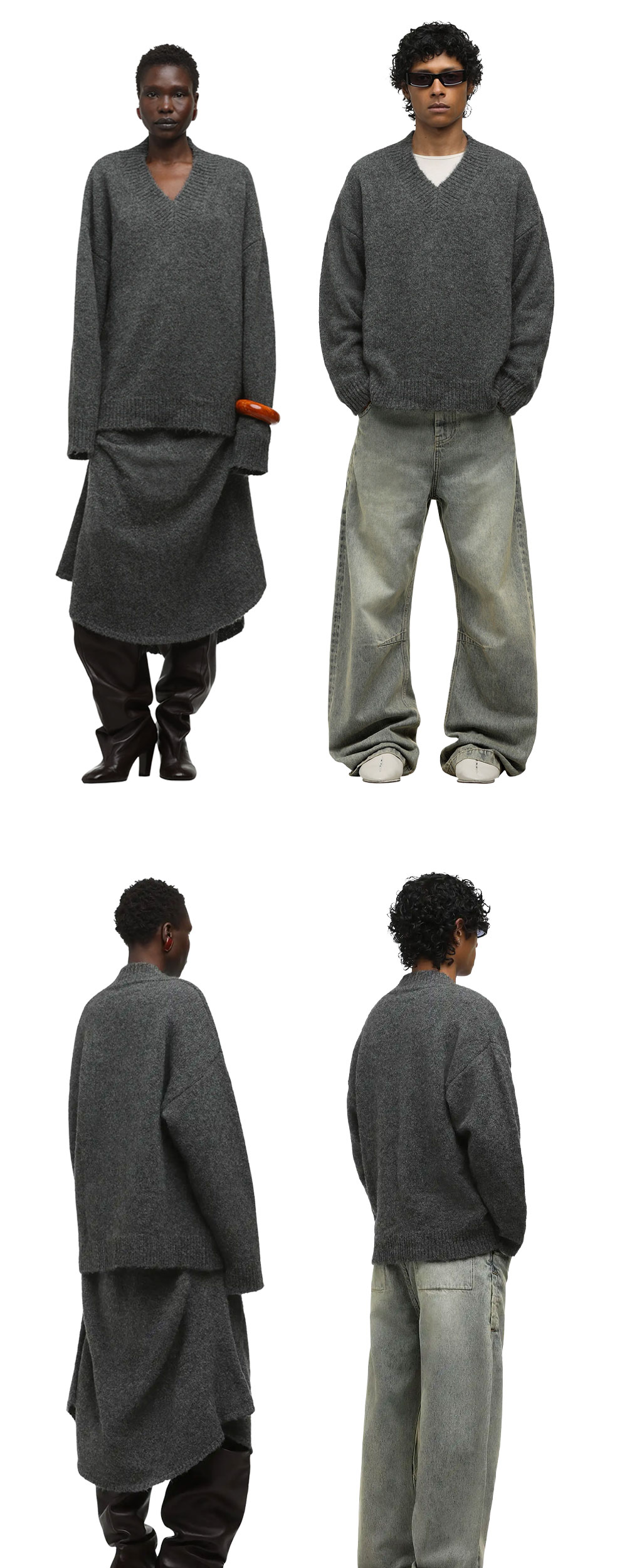 자연스러운 드레이프 핏이 멋스러운 엔타이어스튜디오 데코 스웨터 스모크 컬러입니다. - 청키한 립 조직의 니트 - 드레이프 실루엣 - 오버사이즈 핏 - S사이즈는 XS-S 착용 가능, L사이즈는 M-L 착용 가능 *좌측 모델은 175cm, M사이즈를 착용했으며, 우측 모델은 188cm, M사이즈를 착용했습니다.