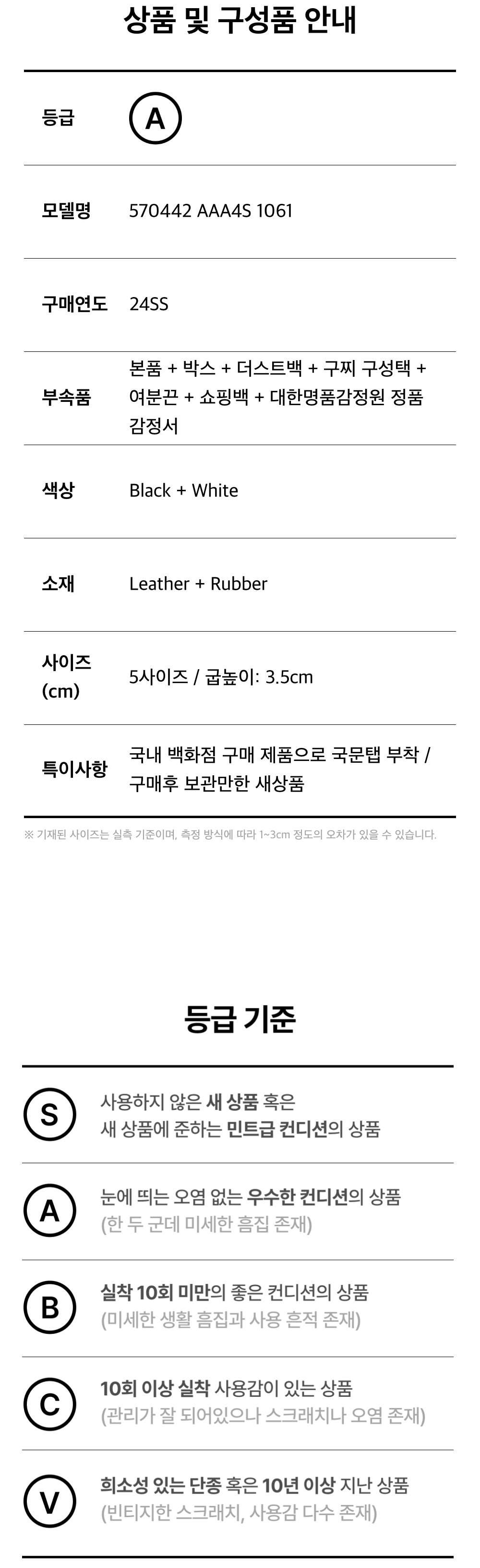 모든 상품(가죽, 의류, 잡화, 슈즈 등)은 사용자의 사용방법과 환경에 따라 변형, 변색이 될 수 있으니 반드시 취급 라벨에 표시된 관리 안내를 따르시길 권장 드립니다. 이는 정도의 차이가 있으며 과도한 체열과 땀, 습기, 빛, 마찰은 제품의 손상 및 변형을 일으킬 수 있으므로 주의하시길 바랍니다.