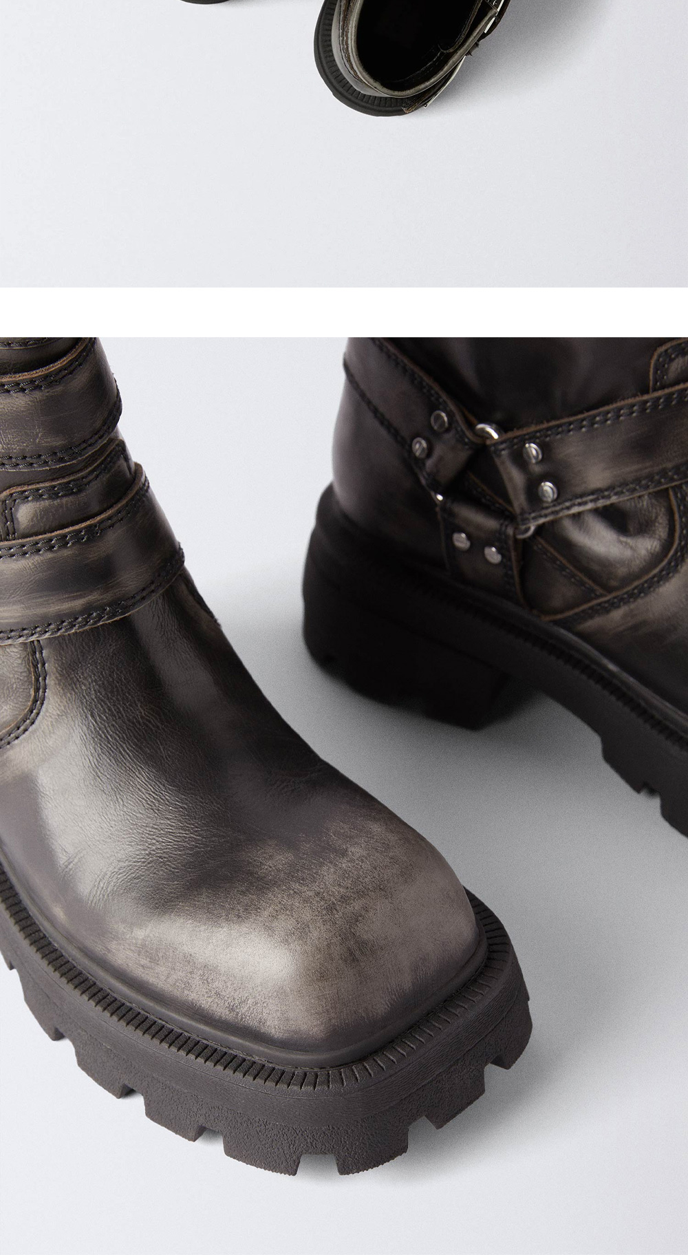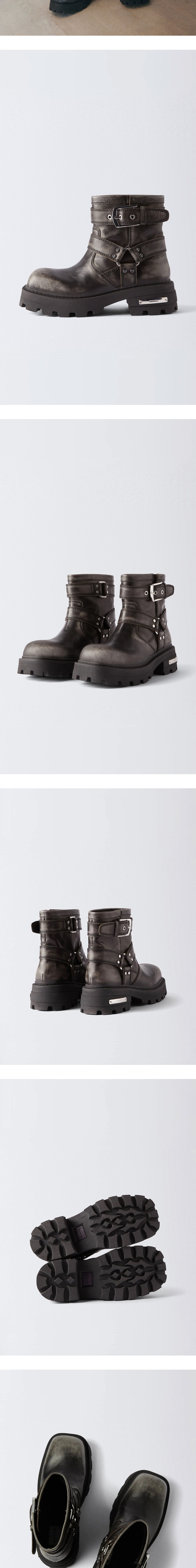 핸드 샌딩 처리된 블랙 가죽으로 자연스럽게 에이징된 듯한 이티스 도미니크 로 빈티지 블랙입니다. - 메탈 하드웨어가 더해진 탄탄한 하니스 디테일이 돋보임 - 과감한 트레드 패턴의 러버 아웃솔이 뛰어난 접지력을 제공 - 힐 부분에는 EYTYS 특유의 메탈 플레이트 디테일이 적용 - 겉감: 소가죽, 안감: 코튼 *앞코가 넓은 형태로 디자인되어 발끝이 다소 여유 있게 느껴질 수 있음. 발볼이 좁거나 사이즈가 반 사이즈 사이에 해당되는 경우, 한 사이즈 작게 선택하시길 권장함